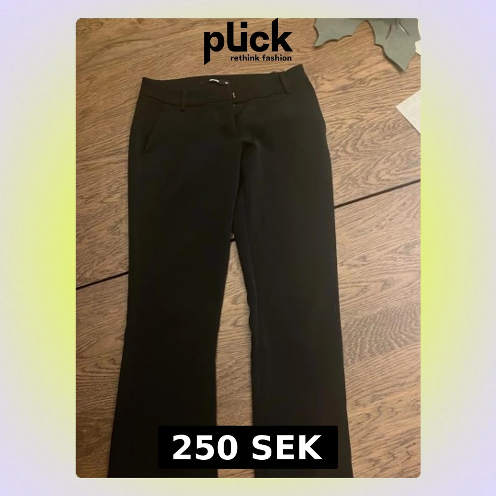 Snygga svarta kostymbyxor, bootcut och klassiska fickor fram. Byxorna har bälteshällor och stängs med knapp och dragkedja. Sparsamt använda💕