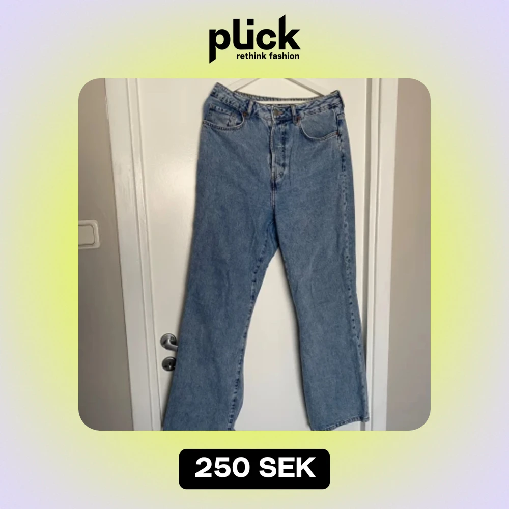 Ljusblå jeans från bikbok, strl 32 i midjan, och 30 i benen. Jag själv är 164cm lång och dom går precis över fötterna på mig. Har fickor både bak- och framtill. Använt en gång. Hög i midjan, dessa jeans är en del av deras ’peachy’ kollektion. Priset
