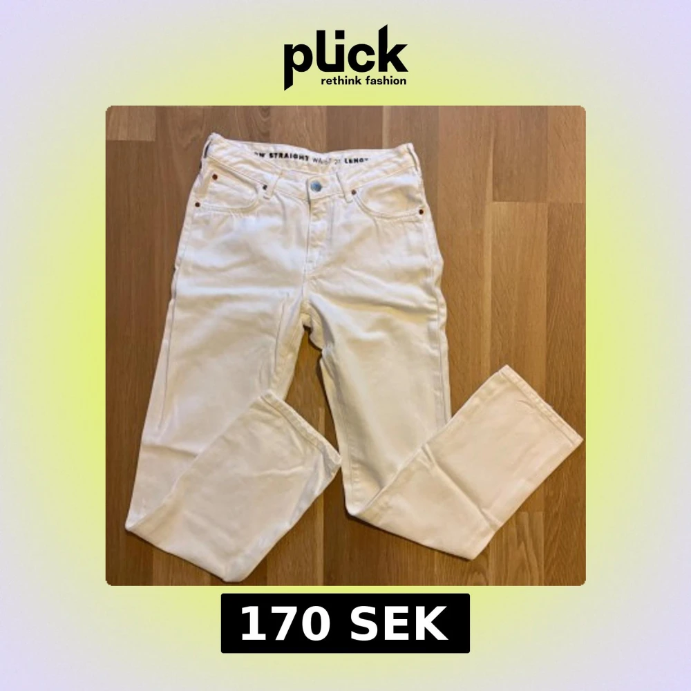Snygga vita jeans från Bik Bok i modellen low straight. Klassisk femficksdesign, låg midja och raka ben. Jeansen är tillverkade i bomull och har en stilren look med silverfärgad knapp.