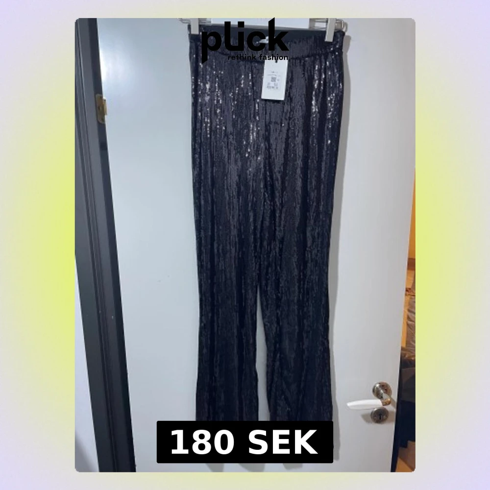 Glittriga svarta byxor från Bik Bok med paljetter över hela tyget. Byxorna har en rak och loose passform med resår i midjan för extra komfort. Perfekta för att sticka ut och ge din outfit extra bling. Snygga att matcha med en enkel topp.