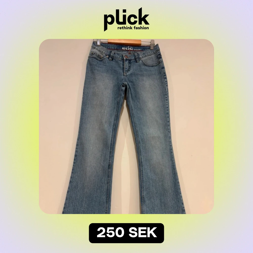 Säljer ett par snygga lågmidjade blå bootcut jeans från EDC i bra skick. Obs: köpta på Vinted och bilderna är där ifrån 💞