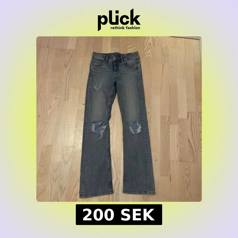 Blå jeans från Kappahl i bootcut-modell med slitna detaljer och hål på knäna. Klassisk femficksdesign, bakfickor med lock och knapp. Jeansen har en snygg tvättad look och är tillverkade i mjukt denimtyg.