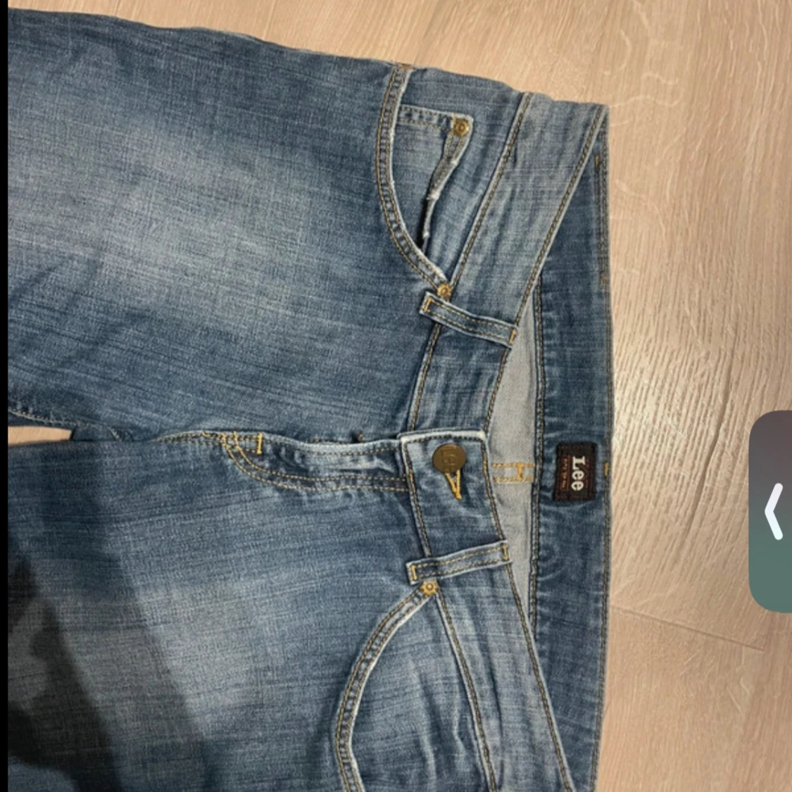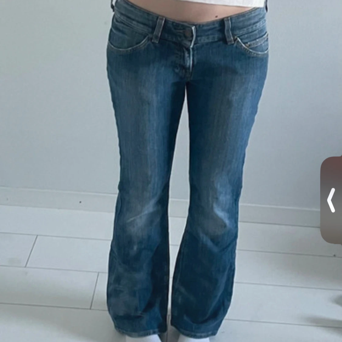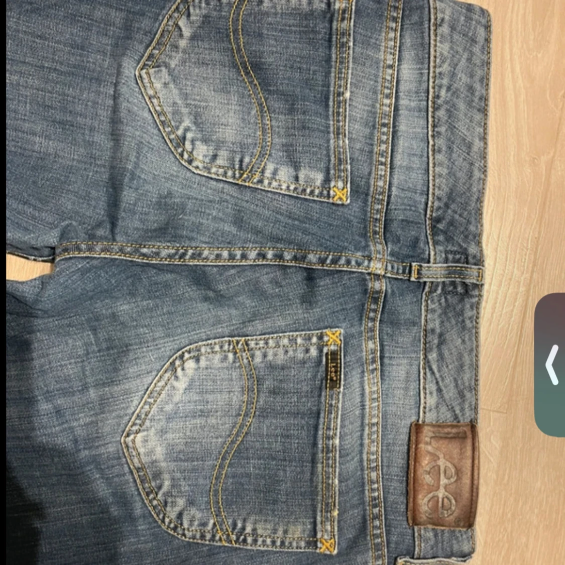 Snygga blå jeans från Lee med klassisk bootcut passform och låg midja. Jeansen har slitningar framtill, fem fickor och detaljerade sömmar med Lee-logga på baksidan. Passar nog någon som är ca 160-165