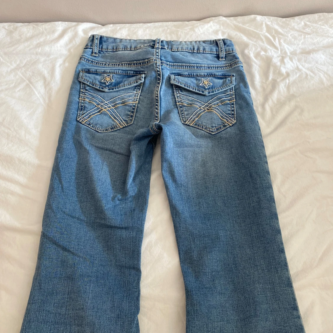 Snygga blå bootcut jeans från Lindex med coola bakfickor som har stjärnbroderi och kontrastsömmar❣️Klassisk femficksmodell i stretchig denim med normal passform och medelhög midja😇.