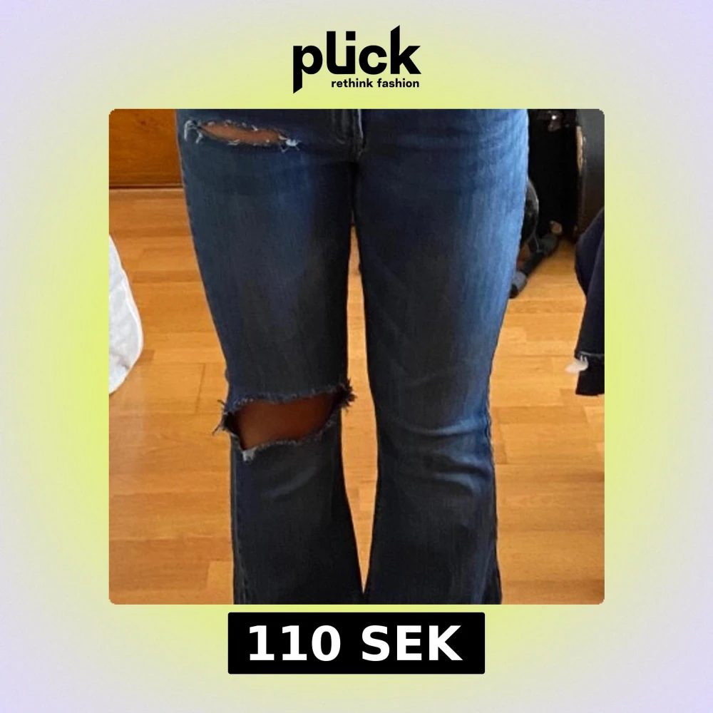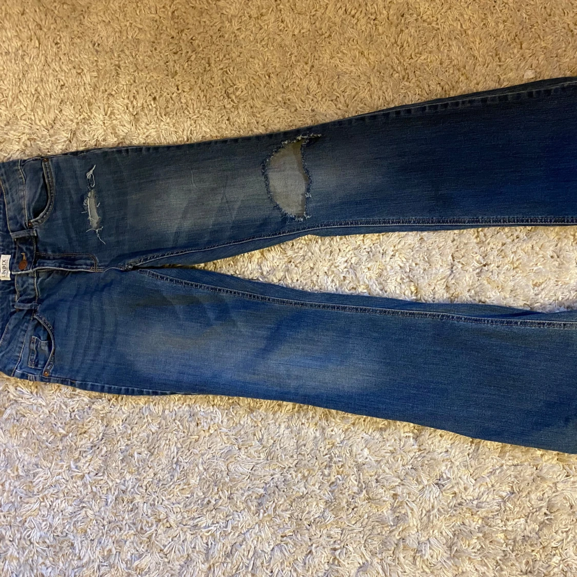 Ge förslag❗️Snygga blå jeans från Lindex med bootcut-ben och slitna detaljer på låret och vid fickan. Storlek 38 men sitter som 34. Klassisk femficksmodell med bälteshällor och dragkedjegylf. Jeansen har en cool tvätt och är perfekta för en avslappnad stil.