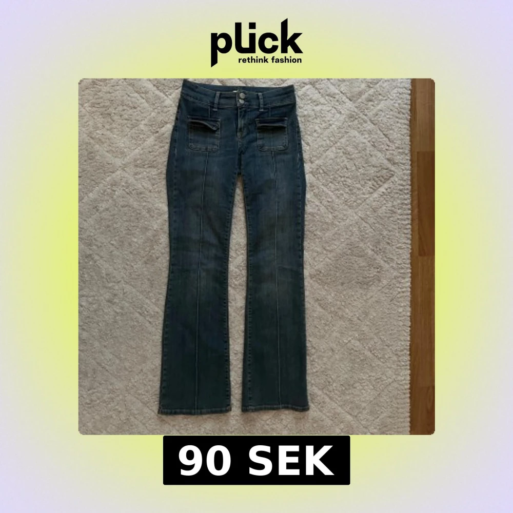 Blå bootcut jeans från Nelly - Snygga blå jeans från Nelly med bootcut-modell och låg midja. Jeansen har markerade sömmar längs benen, dubbla framfickor med dragkedjedetaljer och klassiska bakfickor. Perfekta för dig som gillar en retro vibe och vill ha något som sticker ut. Jag är inte säker men tror den är i storlek 36, den är iaf för 152 cm.