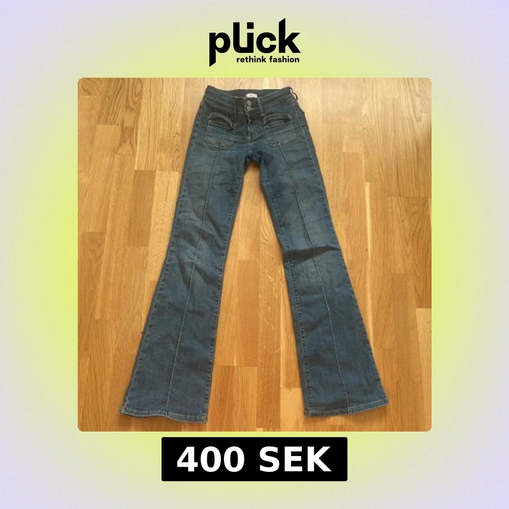 Snygga blå jeans från Nelly med bootcut passform och låg midja. Jeansen har markerade sömmar längs benen och coola fickor framtill. Väldigt bra i skick. Säljer för de tyvärr har blivit för små för mig