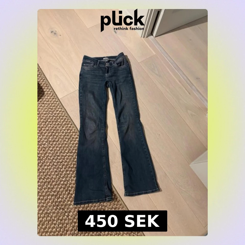 Snygga blå jeans från Nelly med bootcut passform och klassisk femficksdesign. Jeansen har vita dekorativa sömmar på bakfickan och dubbla silverfärgade knappar i midjan. Perfekt för dig som gillar en retro vibe och vill ha lite extra sväng i benen.