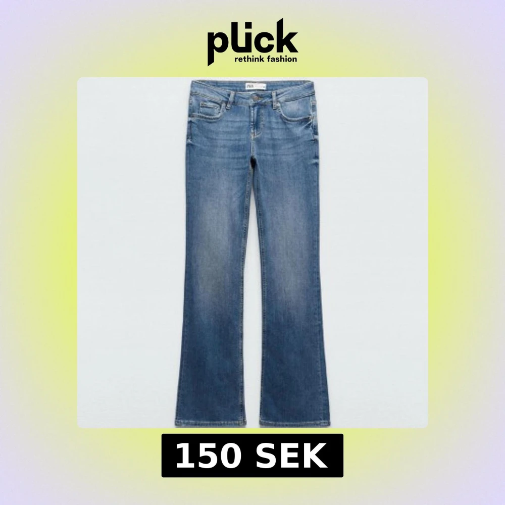 Snygga blå low waist bootcut jeans från Zara. Midjemått 38 och innerbensmått 80. Midjan är insydd på sidorna men går enkelt att sprätta upp.