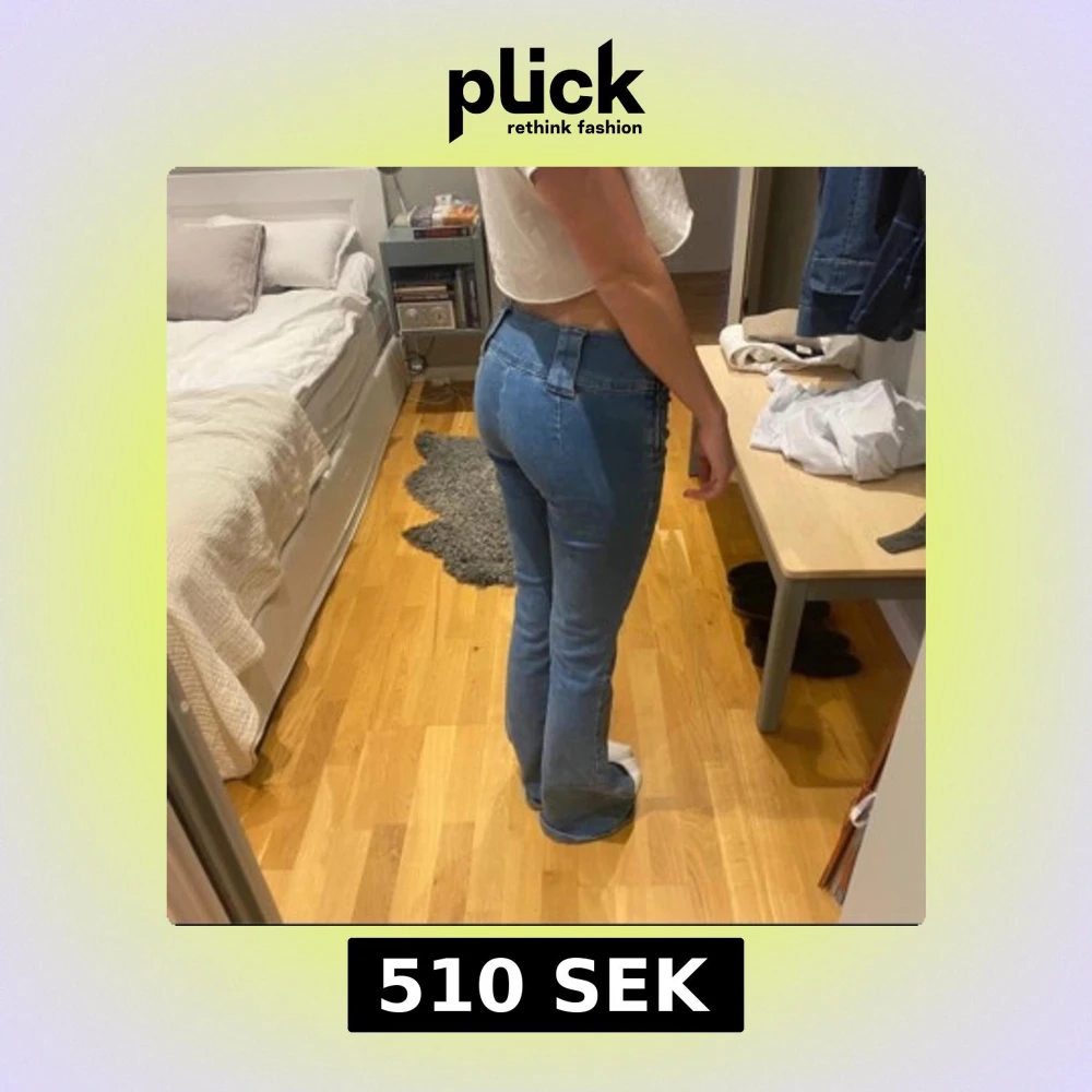 Säljer ett par blå jeans med låg midja och bootcut-snitt. Jeansen har markerade sömmar framtill och breda hällor i midjan. Klassisk denimlook med en snygg passform som sitter tajt upptill och släpper ut vid benen. Perfekta för dig som gillar retrovibbar!