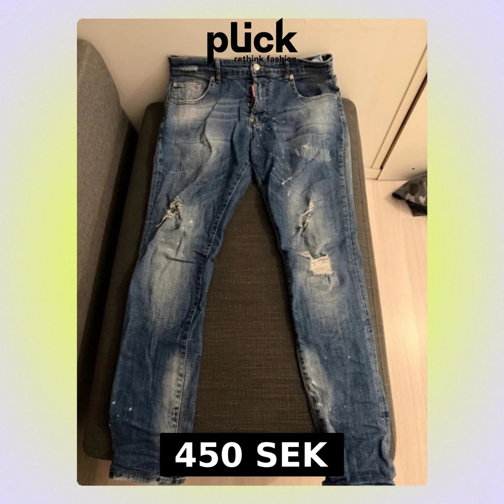 Säljer ett par blå jeans från Dsquared2 med slitna detaljer och snygga hål på benen. Jeansen har klassisk femficksdesign, knappgylf och Dsquared2-logga på etiketten bak. Materialet är jeans med en tvättad look och vita färgstänk för extra edge.