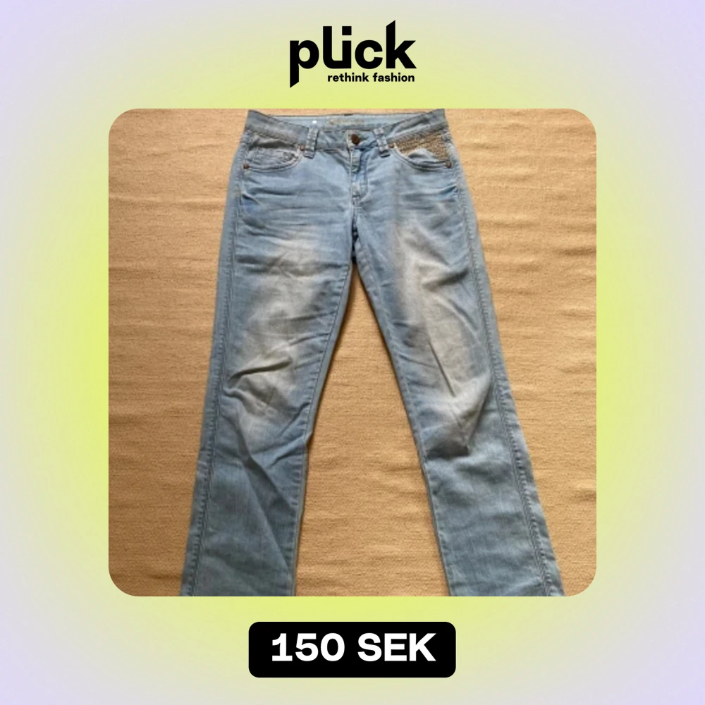 Säljer ett par ljusa jeans. De har snygga broderade detaljer på fickorna både fram och bak. Jeansen har en klassisk femficksdesign och stängs med en knapp och dragkedja. Perfekta för en avslappnad vardagslook! Köpta second hand men inte använda så mycket av mig pga lite för stora, men ändå fint skick. low -> mid rise skulle jag säga.
