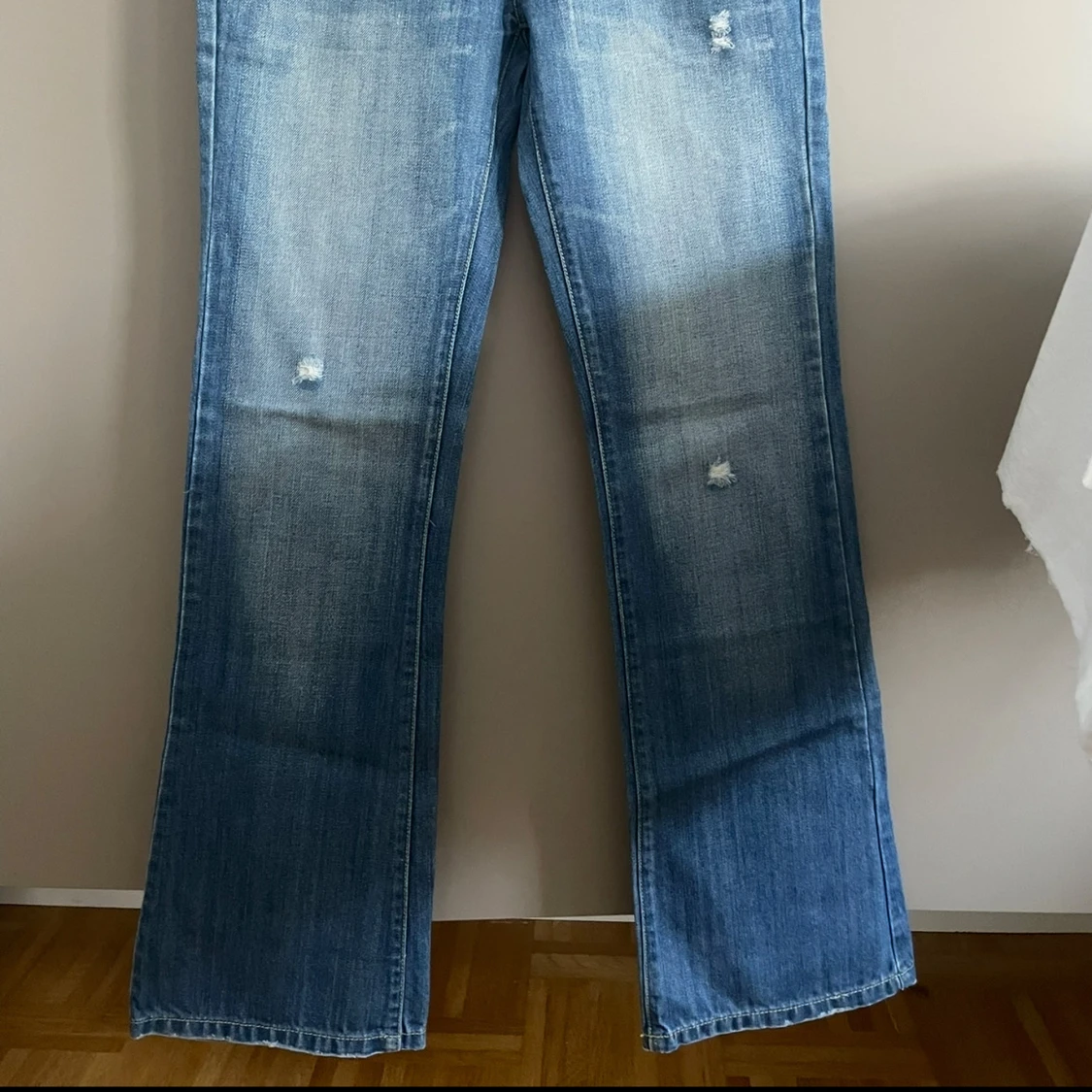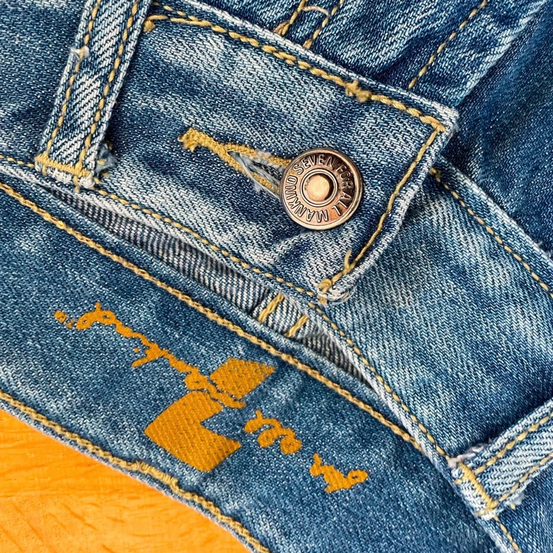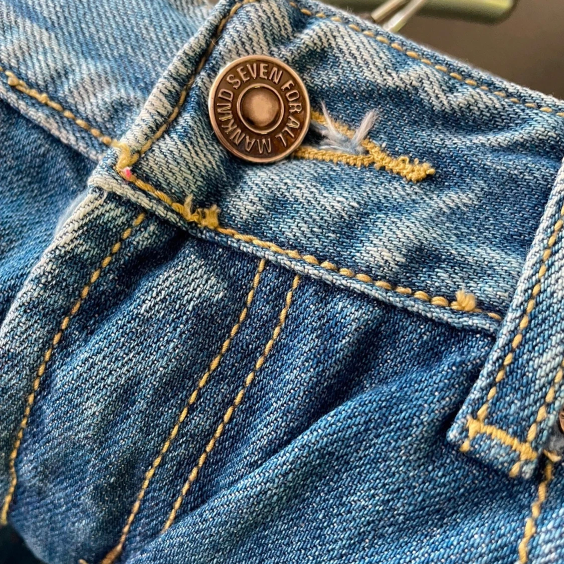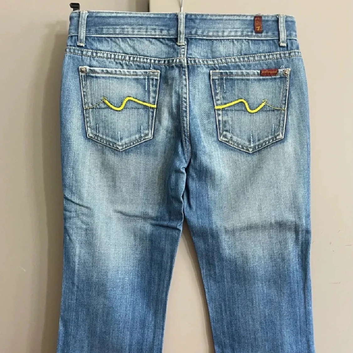Snygga blå jeans från 7 For All Mankind med slitningar och ljus tvätt. Klassisk femficksmodell med gult broderi på bakfickorna och detaljerade sömmar. Jeansen har rak passform och är tillverkade i mjukt denimtyg för en skön känsla.
