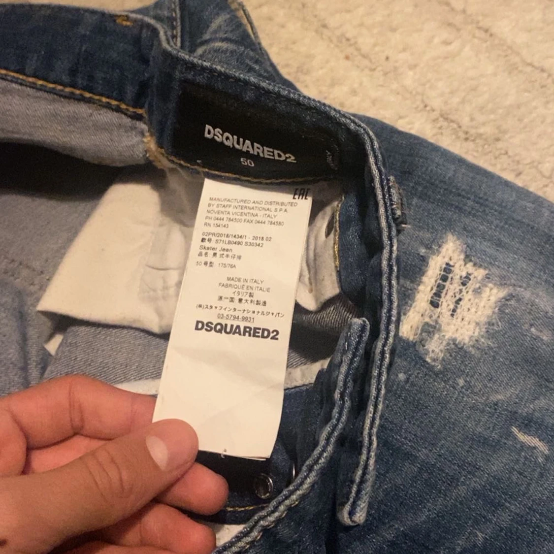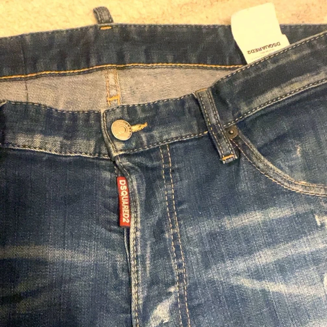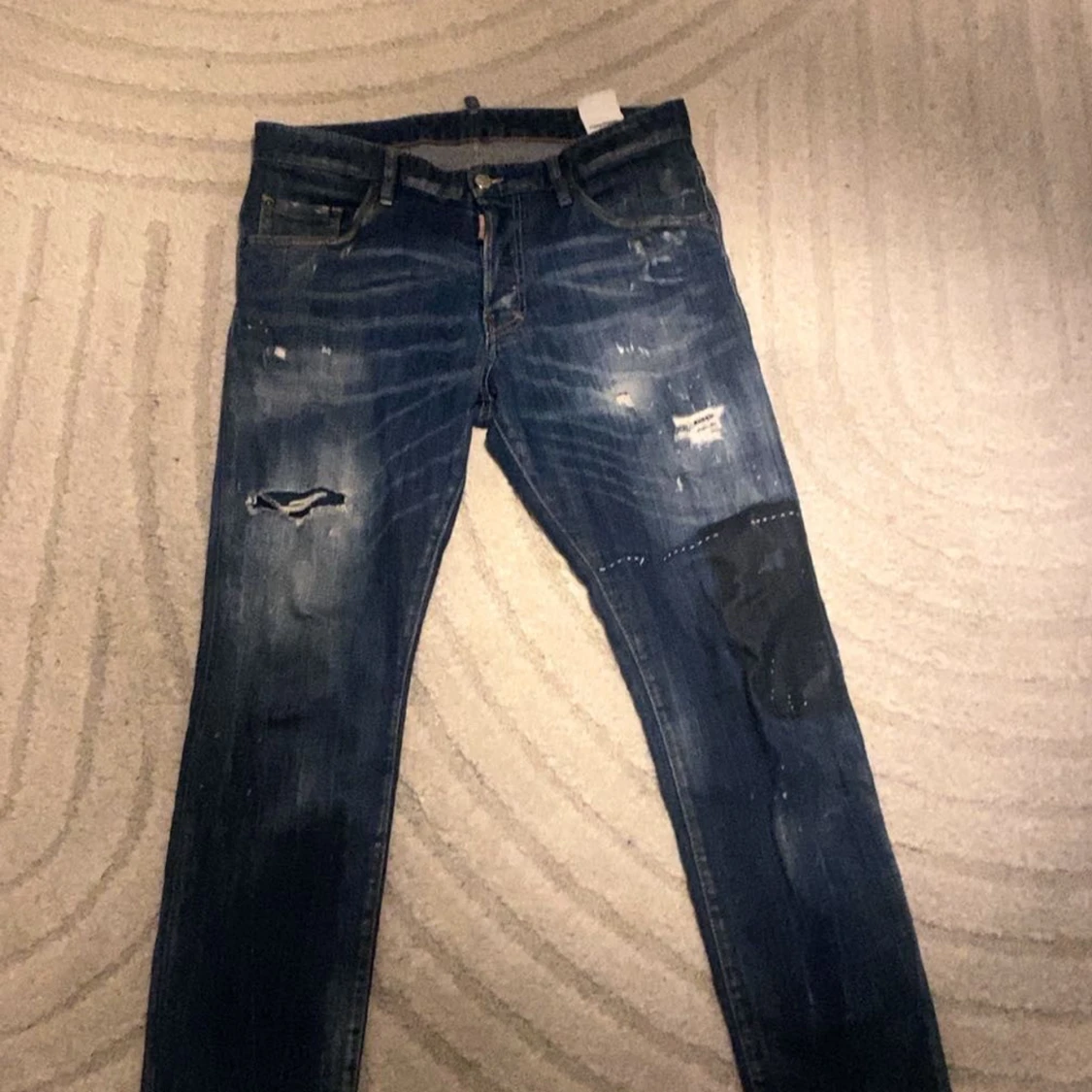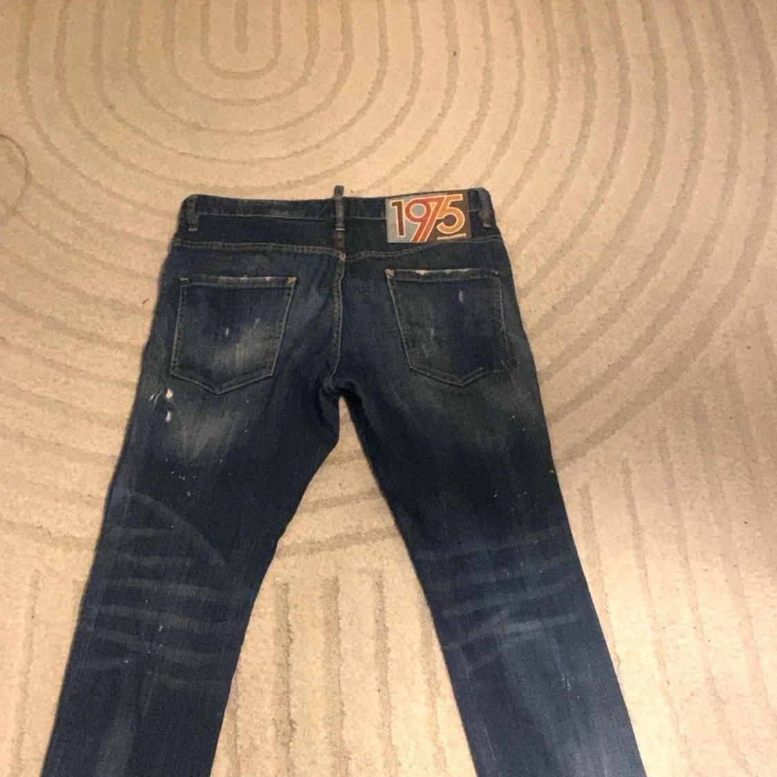 Snygga blå jeans från Dsquared2 med slitna detaljer och en cool patch med '1975' på baksidan. De har en klassisk femficksdesign och en knappgylf. Perfekta för en avslappnad stil med en touch av edge.