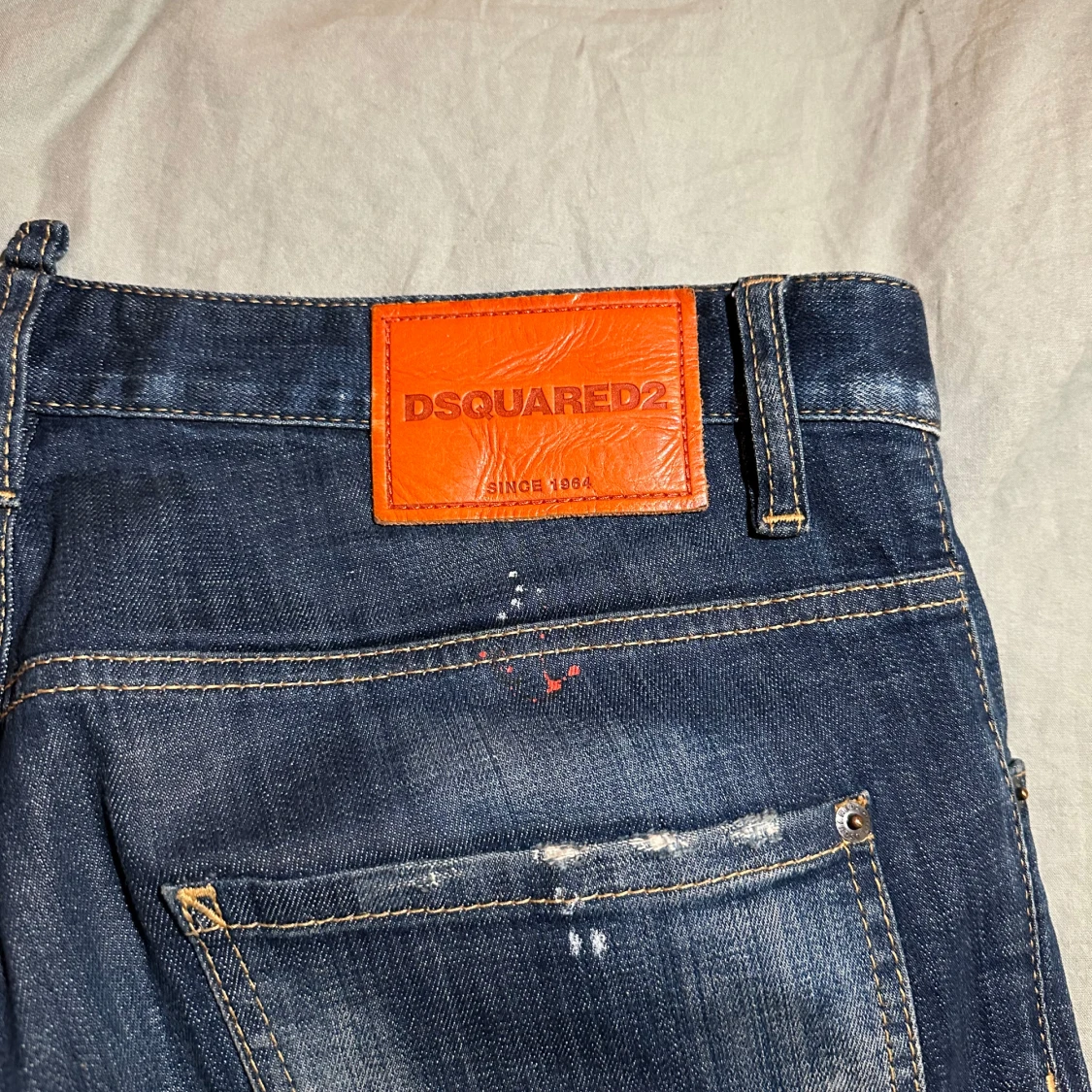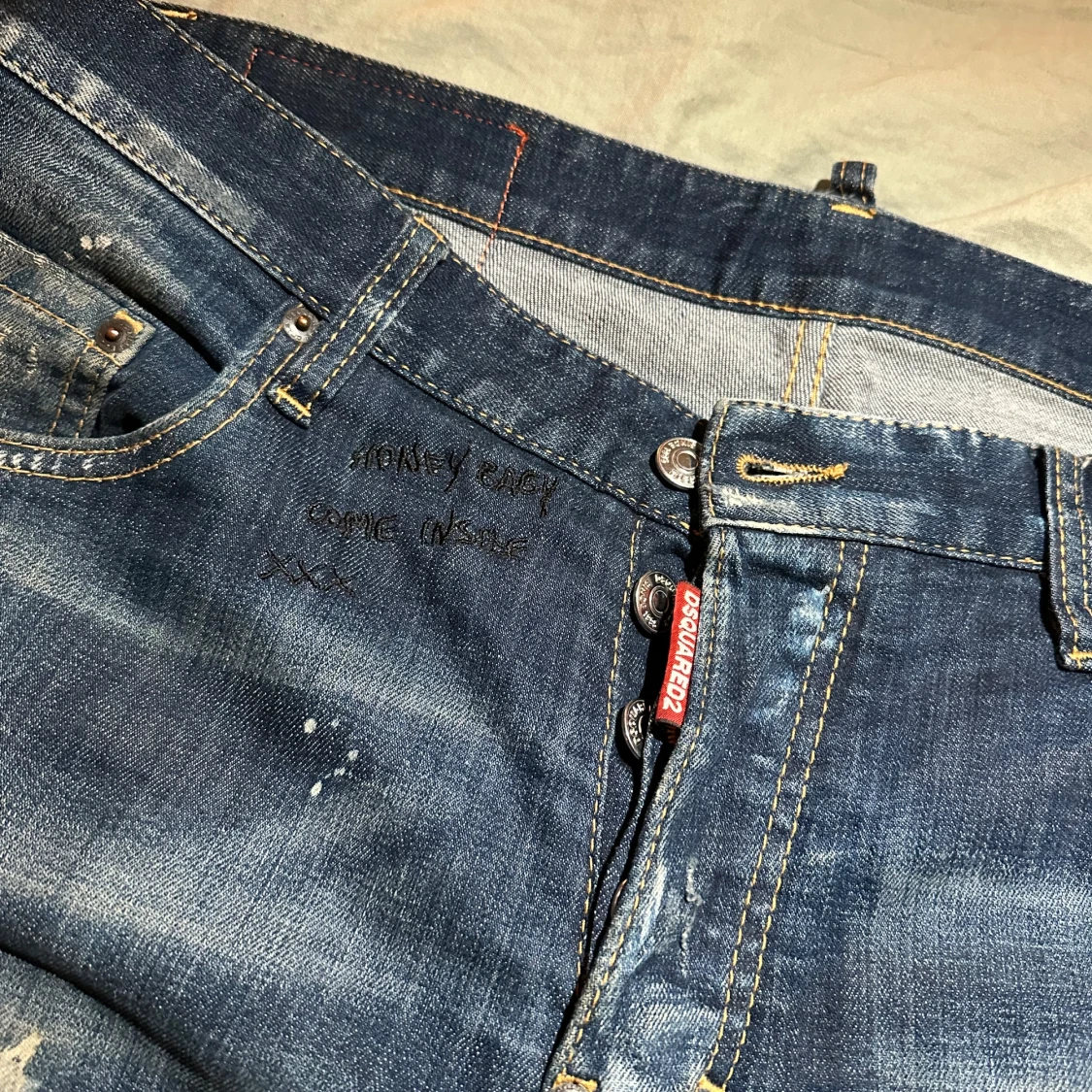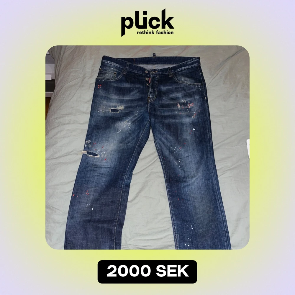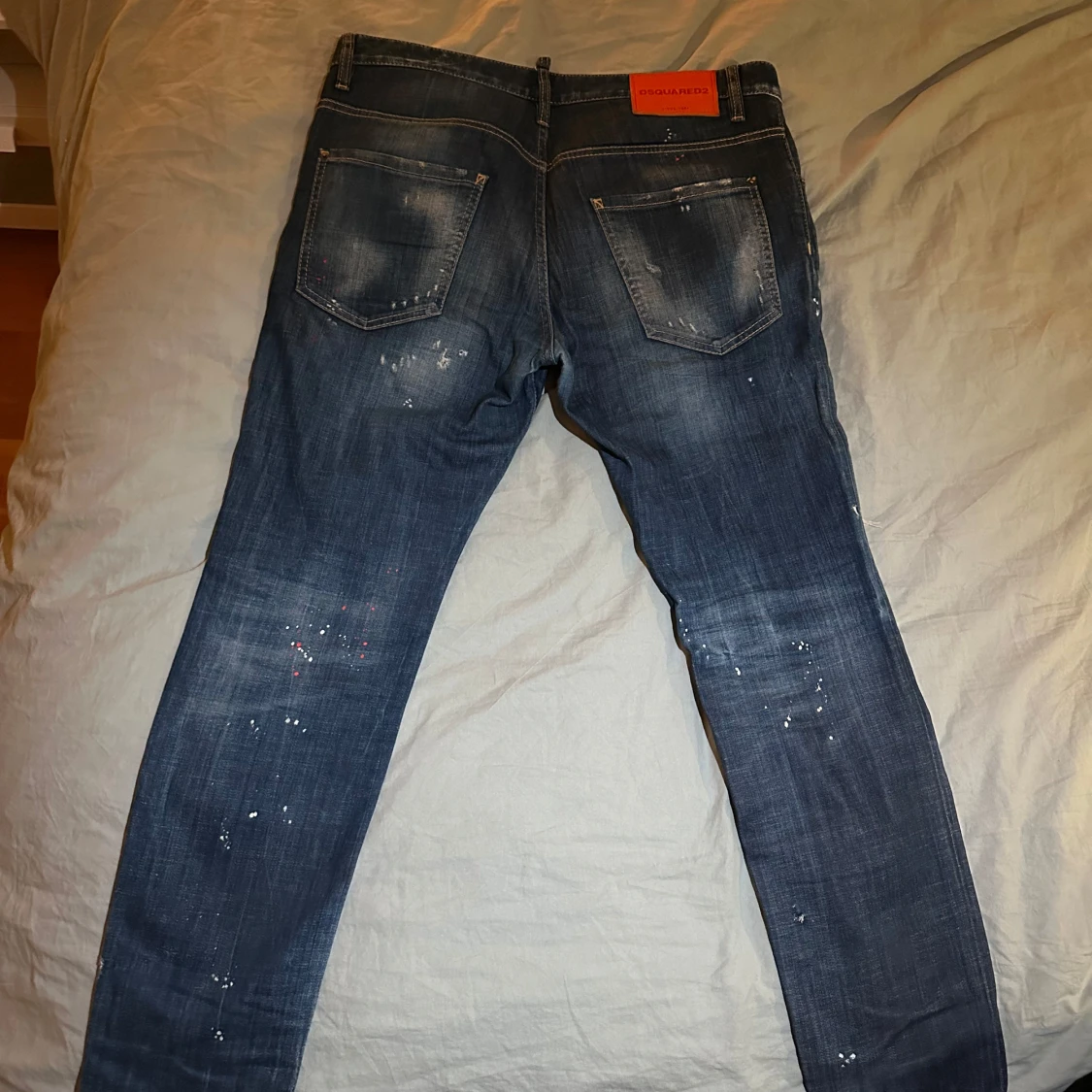 Säljer ett par coola blå jeans från DSQUARED2 med slitna detaljer och färgstänk för en edgy look. De har en knappgylf och klassisk femficksdesign. Perfekta för en avslappnad stil med lite attityd. Passar bra till både vardag och fest!