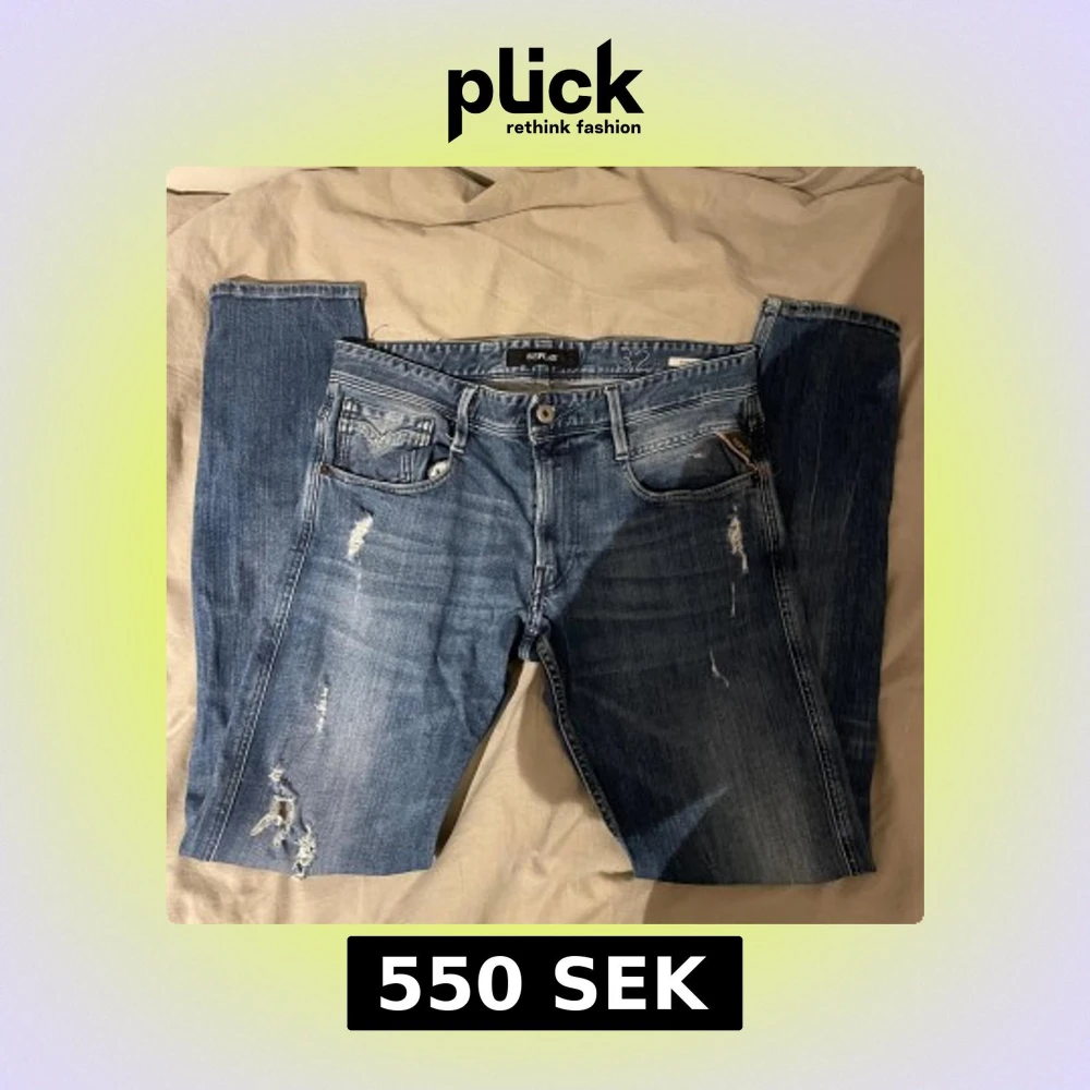 Snygga blå jeans från Replay model Anbass med slitna detaljer. 10/10 skick med inga defekter. Storleken är 32/34, priset är diskuterbart vid snabb affär. Hör gärna av er vid fundering!