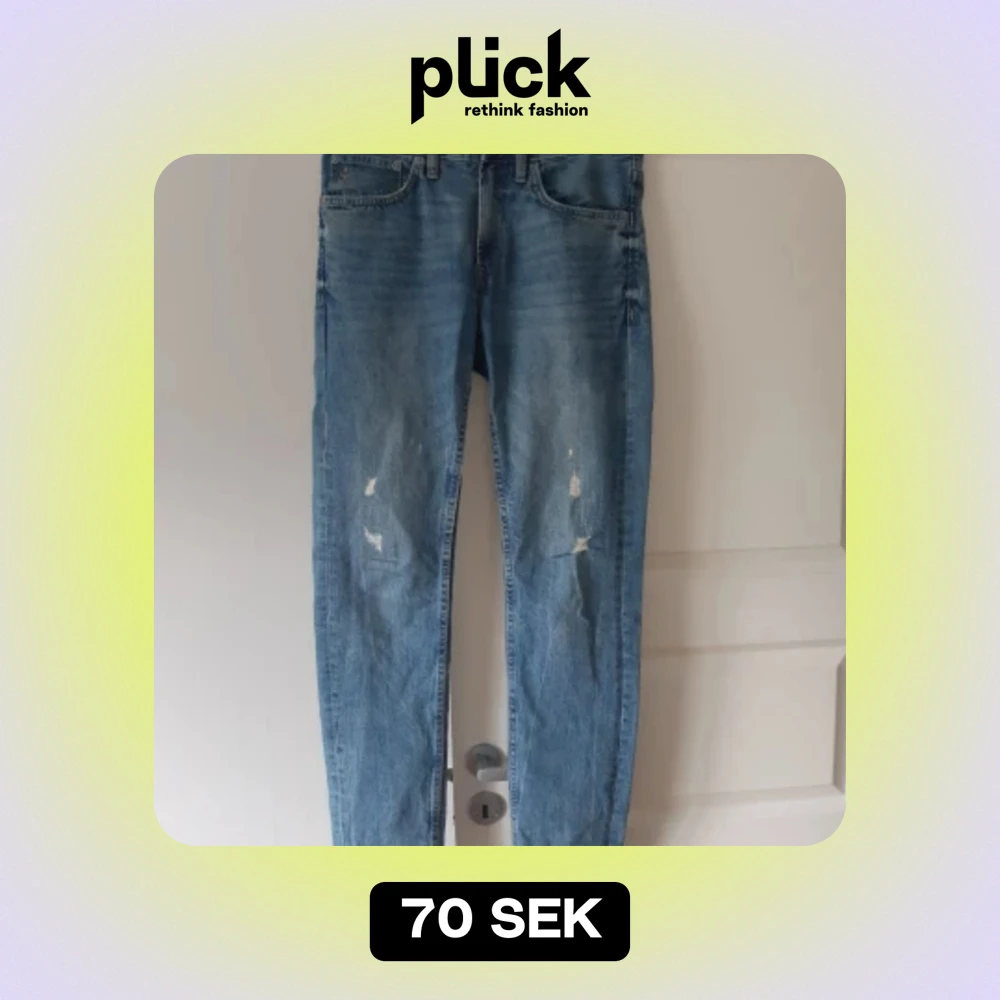 Säljer ett par snygga blå jeans med coola slitningar på framsidan. De har en klassisk femficksdesign och en läderpatch med logga på baksidan. Perfekta för en avslappnad stil!