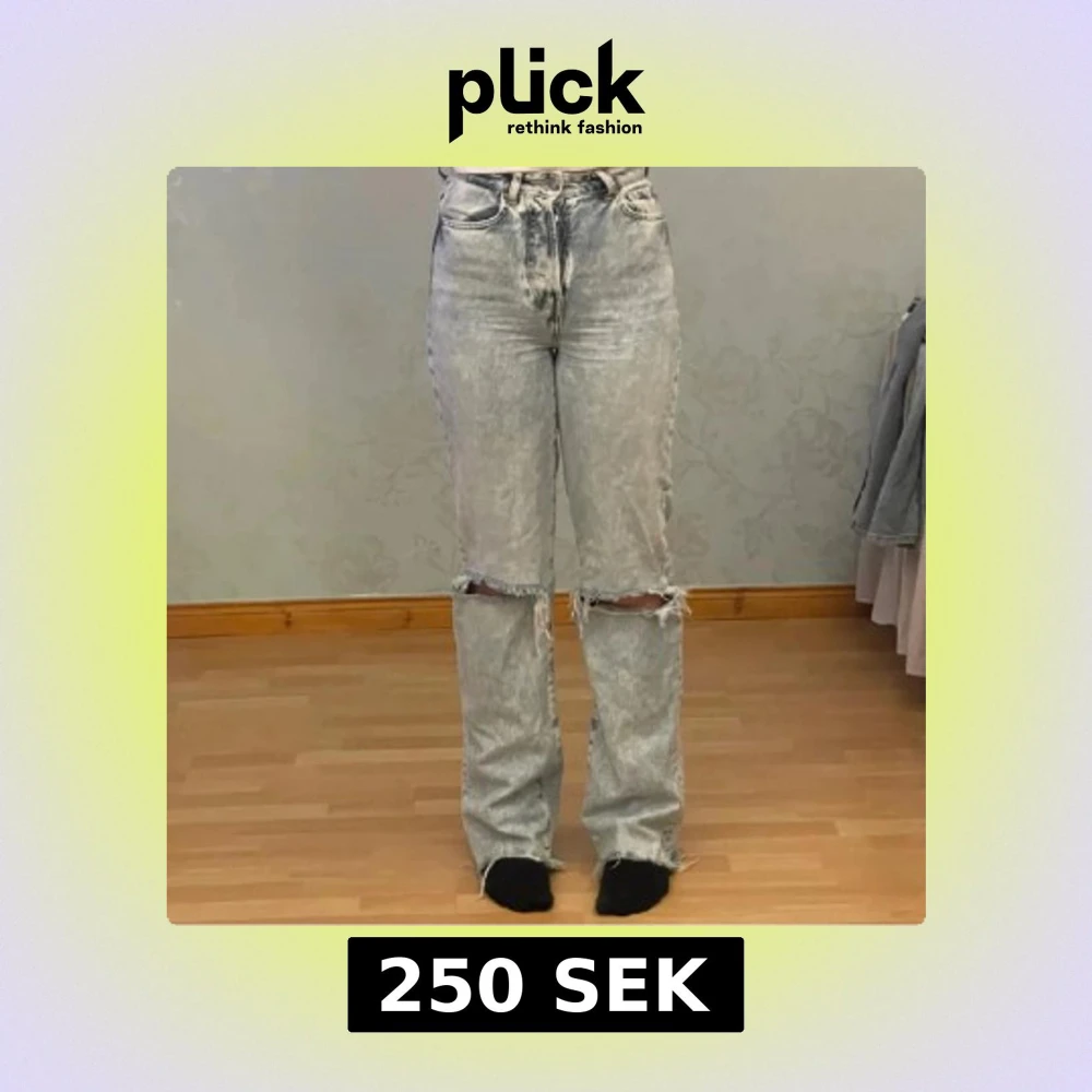 Säljer ett par blå jeans med hög midja och slitna detaljer vid knäna. Jeansen är från bikbok