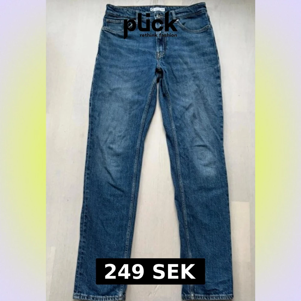 Säljer ett par klassiska blå jeansbyxor från C i regular fit. Modellen har raka ben, fem fickor och en snygg brun patch med '1979' bak på midjan. Jeansen är tillverkade i slitstarkt denim och har en tidlös look med normal passform.