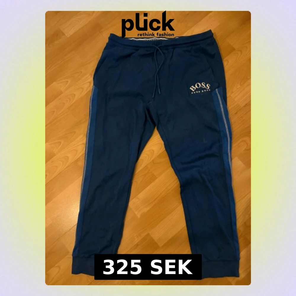 Snygga blå mjukisbyxor från Hugo Boss med logga på vänster sida. Byxorna har snörning i midjan och ribbade muddar vid bensluten. Snygga blå ränder längs sidorna ger en sportig vibe. Perfekta för chill eller träning.