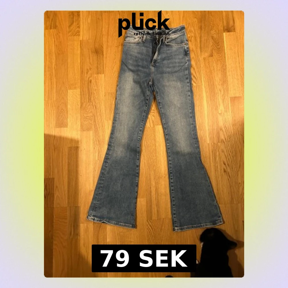Snygga blå Peachy Flare jeans från Never Denim med klassisk femficksdesign och dragkedja. Modellen har hög midja och riktigt utsvängda ben.