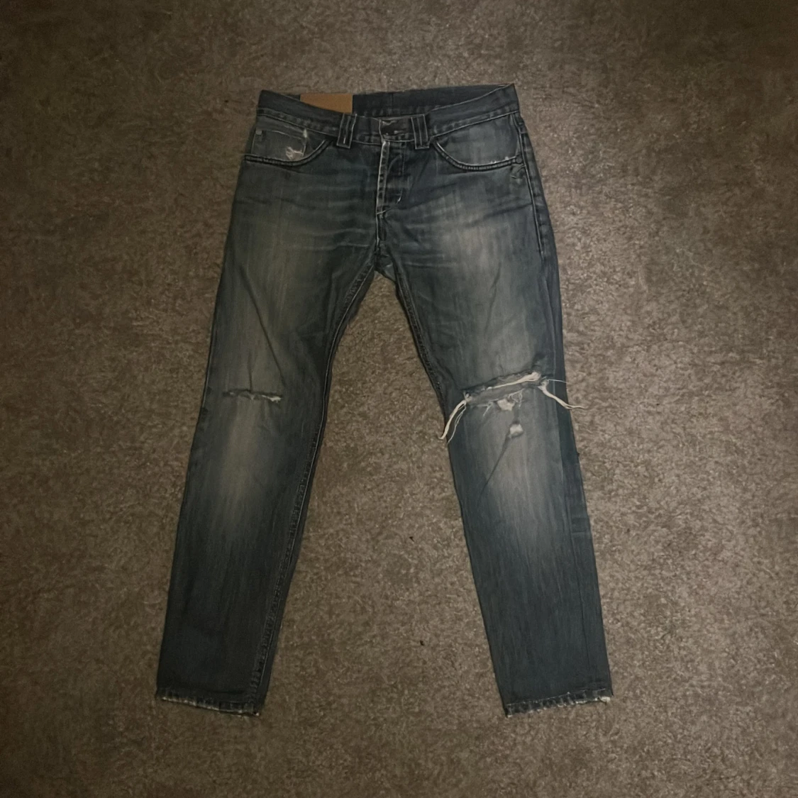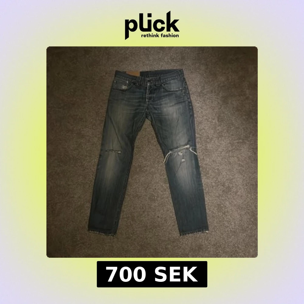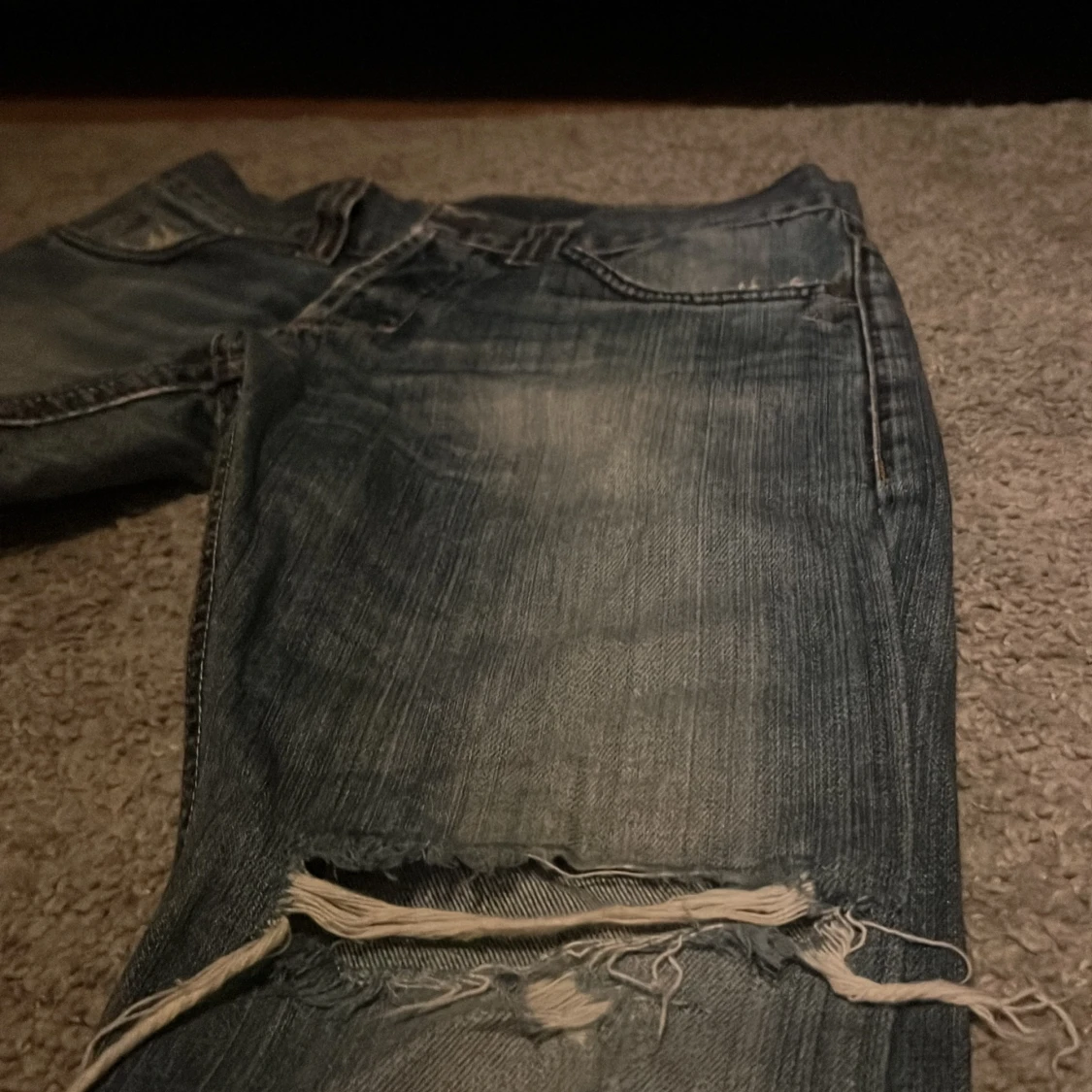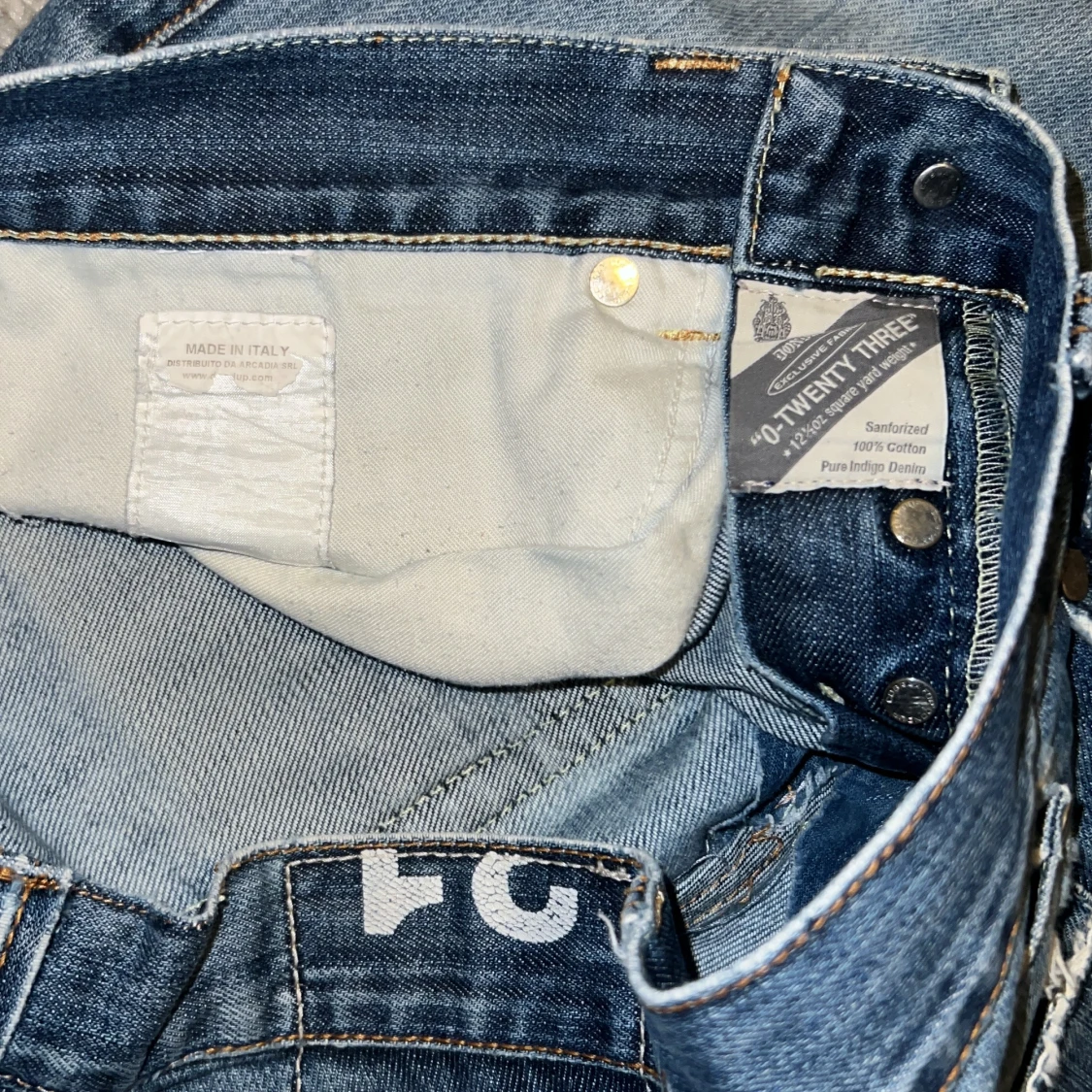 Säljer ett par blå jeans från FC Twenty Three med slitningar och hål på knäna för en rå streetlook. Jeansen har klassisk femficksdesign, raka ben och är tillverkade i 100% bomull. Snyggt tvättade detaljer och fransade kanter vid benslut.
