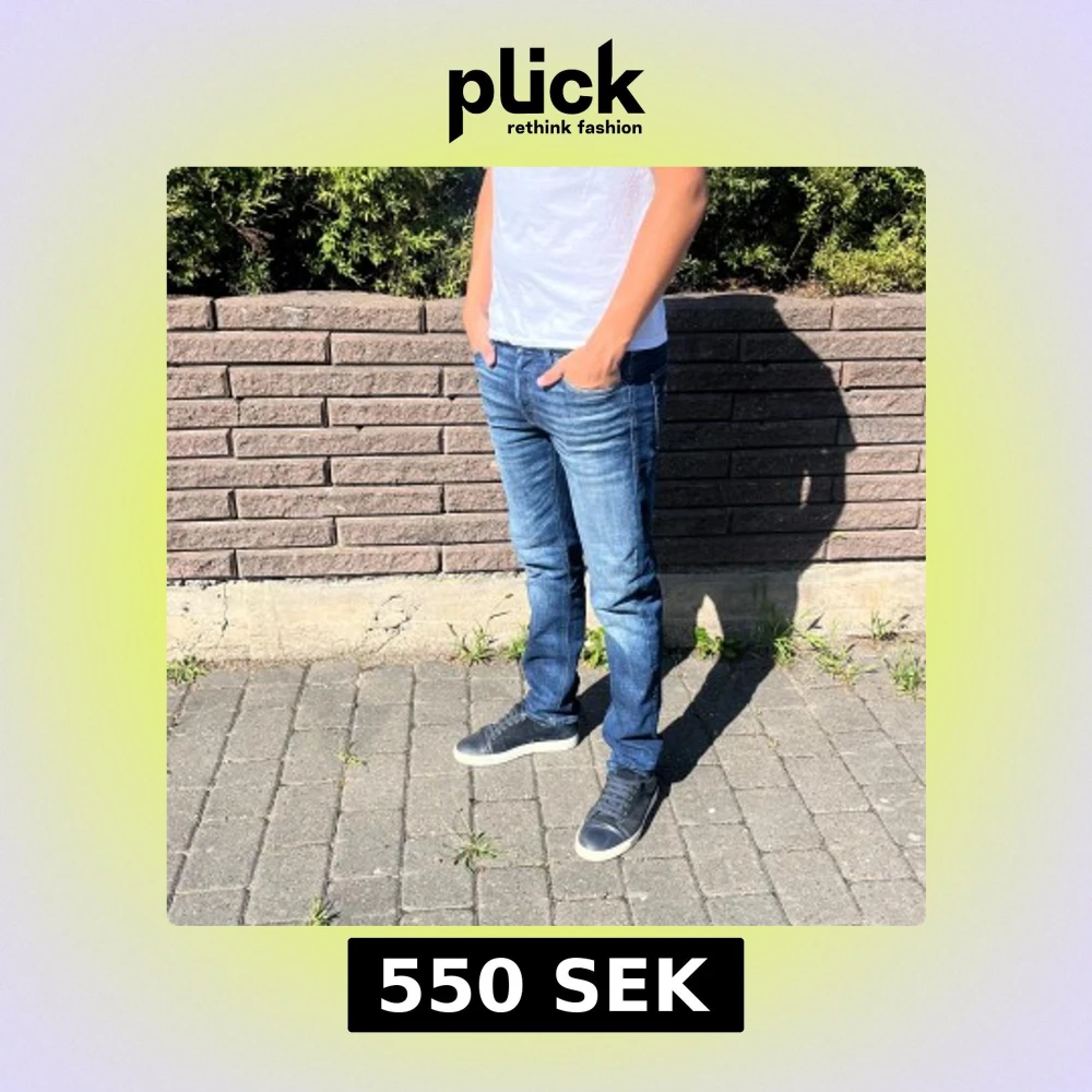 Snygga blå jeans från Jack and Jones. Jeansen har en mörk tvätt med lätt slitning och kontrastsömmar. Killen på bilden är 182 cm. As bra skick och redo att användas