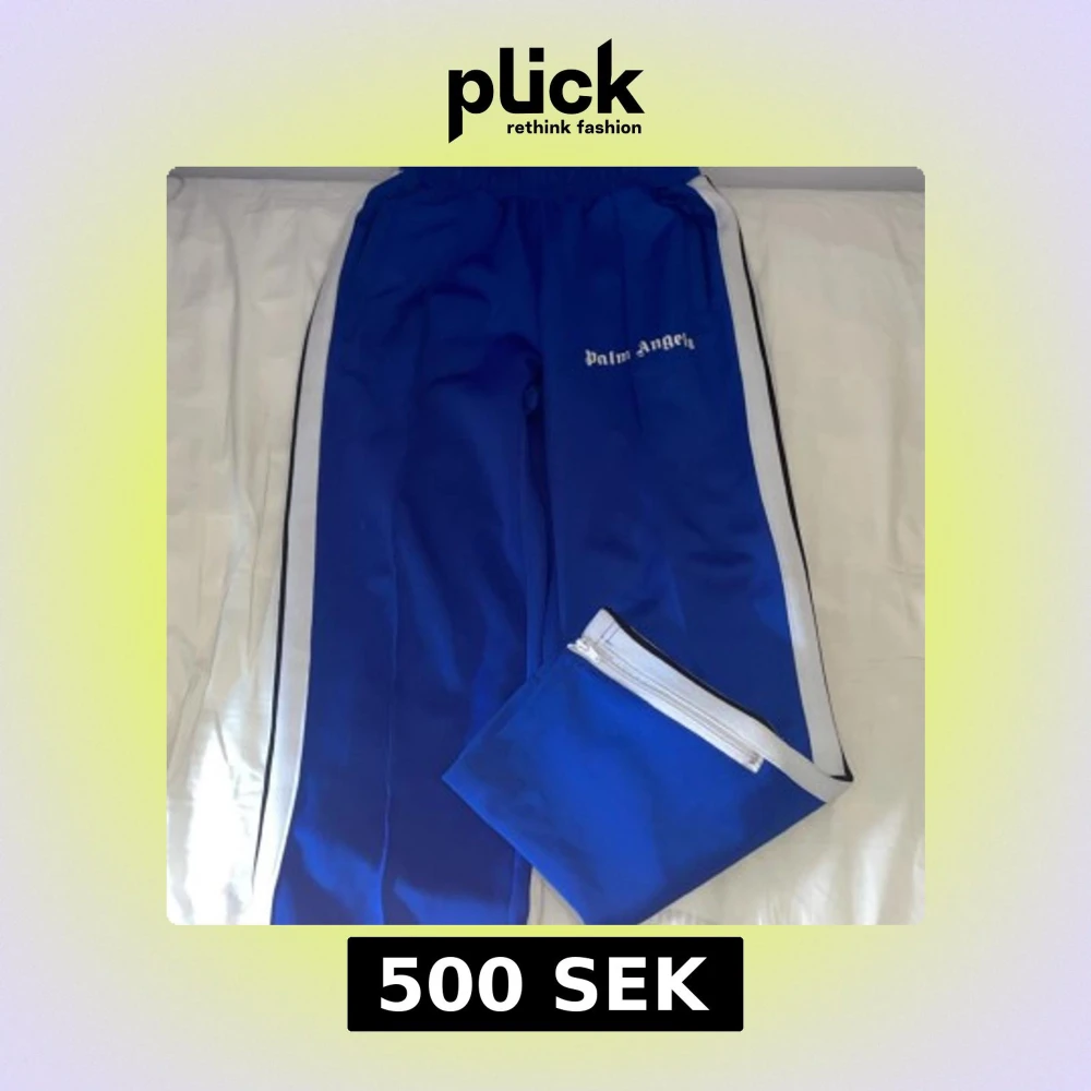 Snygga blåa trackpants från Palm Angels med vita sidoränder och vit logga på låret. Byxorna har elastisk midja och dragkedja vid benslutet. Perfekta för en sportig och trendig look.