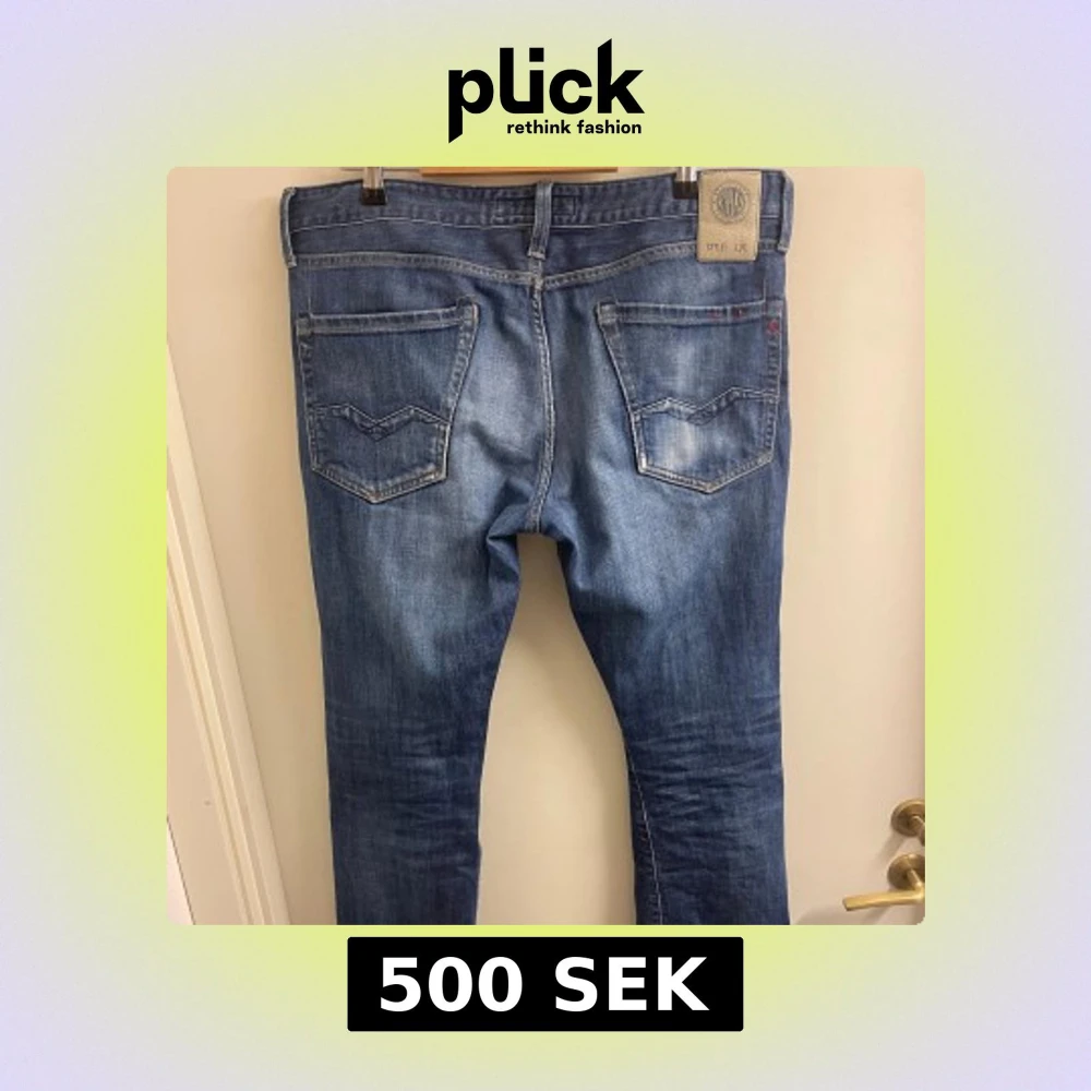 Blåa raka replay jeans i modellen WAITOM i storlek 34w och 32l. Använda fåtal gånger och inga defekter. Har slitage design från början.