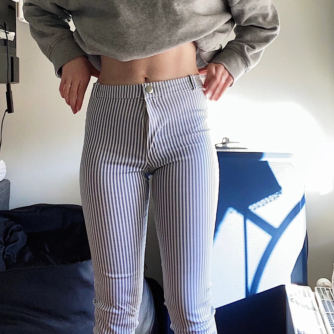 Snygga randiga byxor från mango med slits i benen. Bra passform men ganska lite i storleken. Strl 38 men passar mig som i vanliga fall har 34-36. Knappt använda.