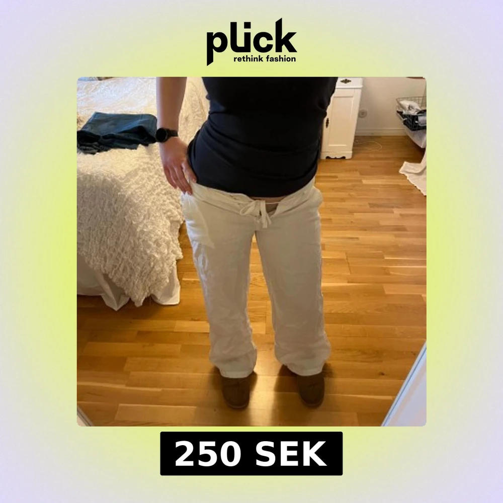 Snygga lågmidjade linnebyxor som tyvärr är för små för mig. Har avslappnad passform och snörning i midjan. Byxorna har broderade detaljer på bakfickorna. Perfekta för sommaren🌸🌝