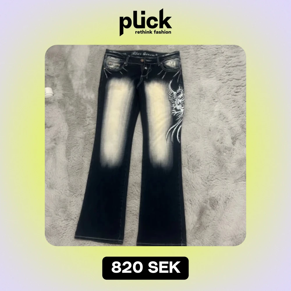 Y2K Jeans Blue Queen - Y2K Bootcut jeans från märket Blue Queen med tryck bak, midjemått 40cm, innerbenslängd 103cm! (intressekoll)
