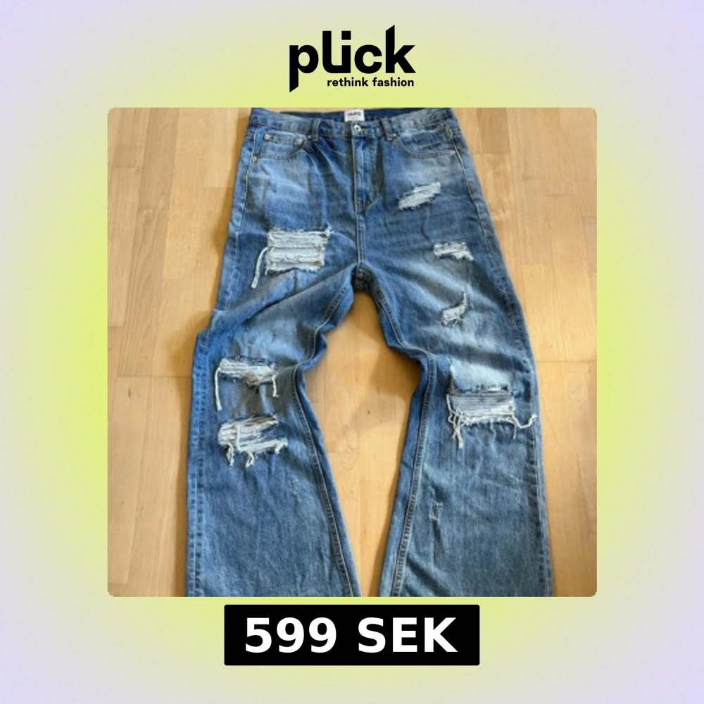 Flared jeans med slitna detaljer, mått och annat kan skickas i dm