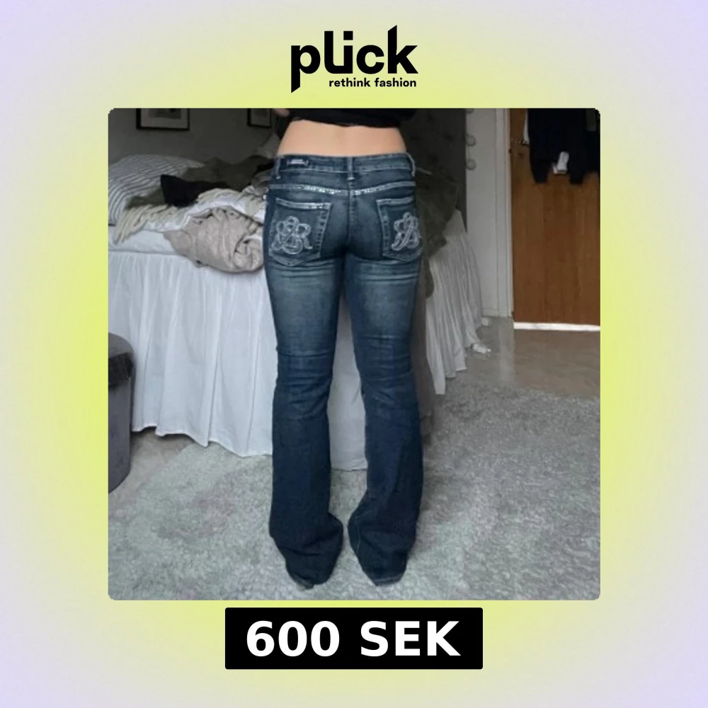 Snygga mörkblå jeans med broderade detaljer på bakfickorna. De har en låg midja och bootcut-stil som ger en klassisk look. Perfekta för en avslappnad stil med en touch av elegans. Supersnygga och knappt använda💕midjemåttet är 42cm, jag är 168 och dom är perfekt längd på mig, jag skulle säga att dom är längd 34. Några stenar baktill saknas, men inget man tänker på (se bild 2) 💞