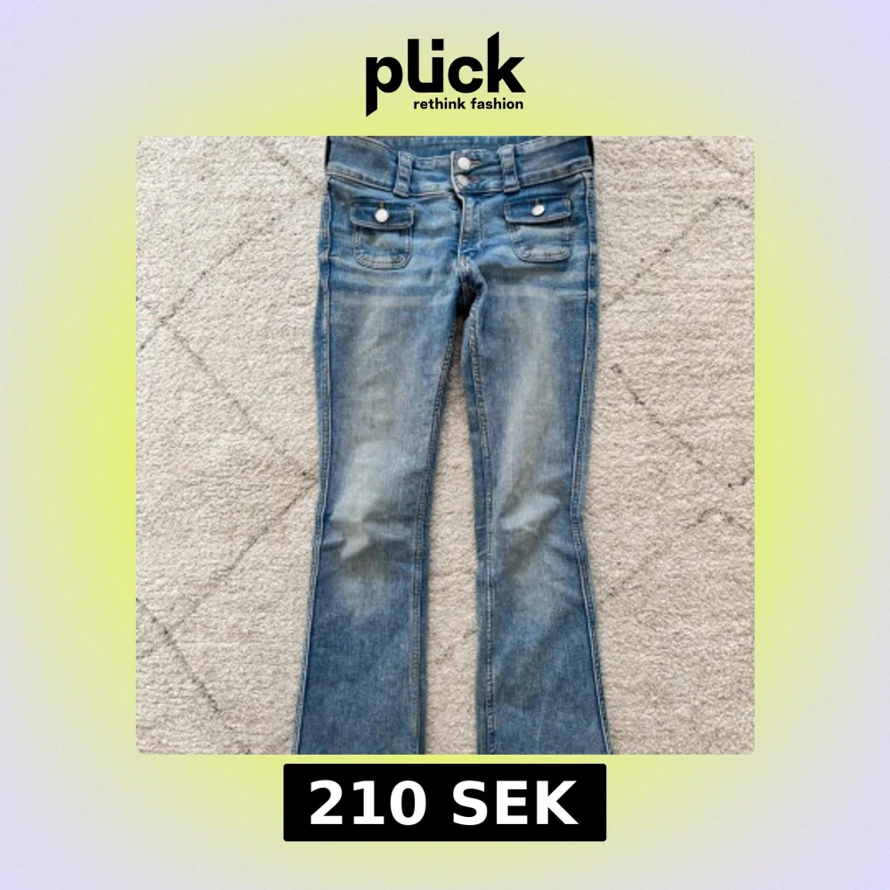 Snygga blå bootcut jeans med dubbla knappar och fickdetaljer fram. De har en klassisk tvätt och en stilren design som passar perfekt till vardags. Jeansen har en normal passform och är tillverkade i ett bekvämt denimtyg. Man kan ändra midjan så den passar som man ser på bild 5 . Den är slutsåld på hm. Den tvättas innan postning!