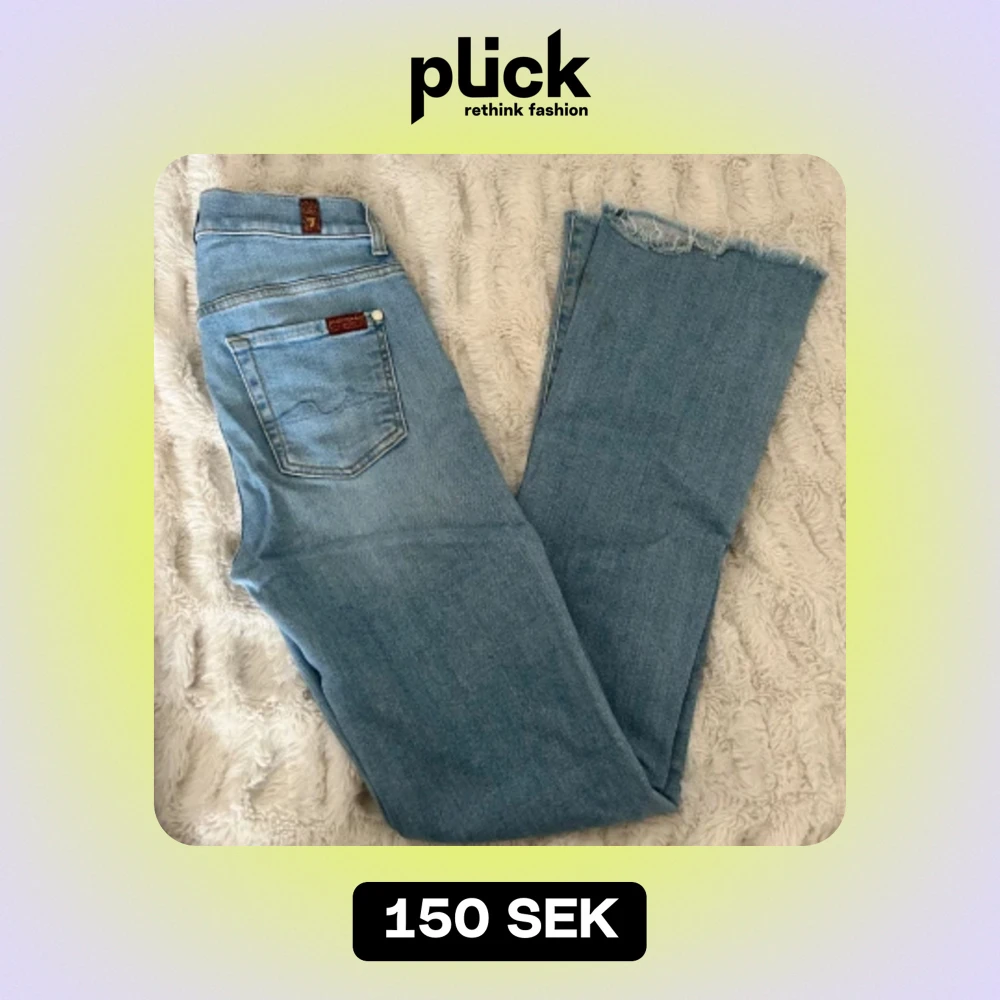 Bootcut jeans från 7 For all mankind, strl 26. Rå kant. Fint skick men något fläckade nertill, se bild 3. Därav priset. Annars fint skick.