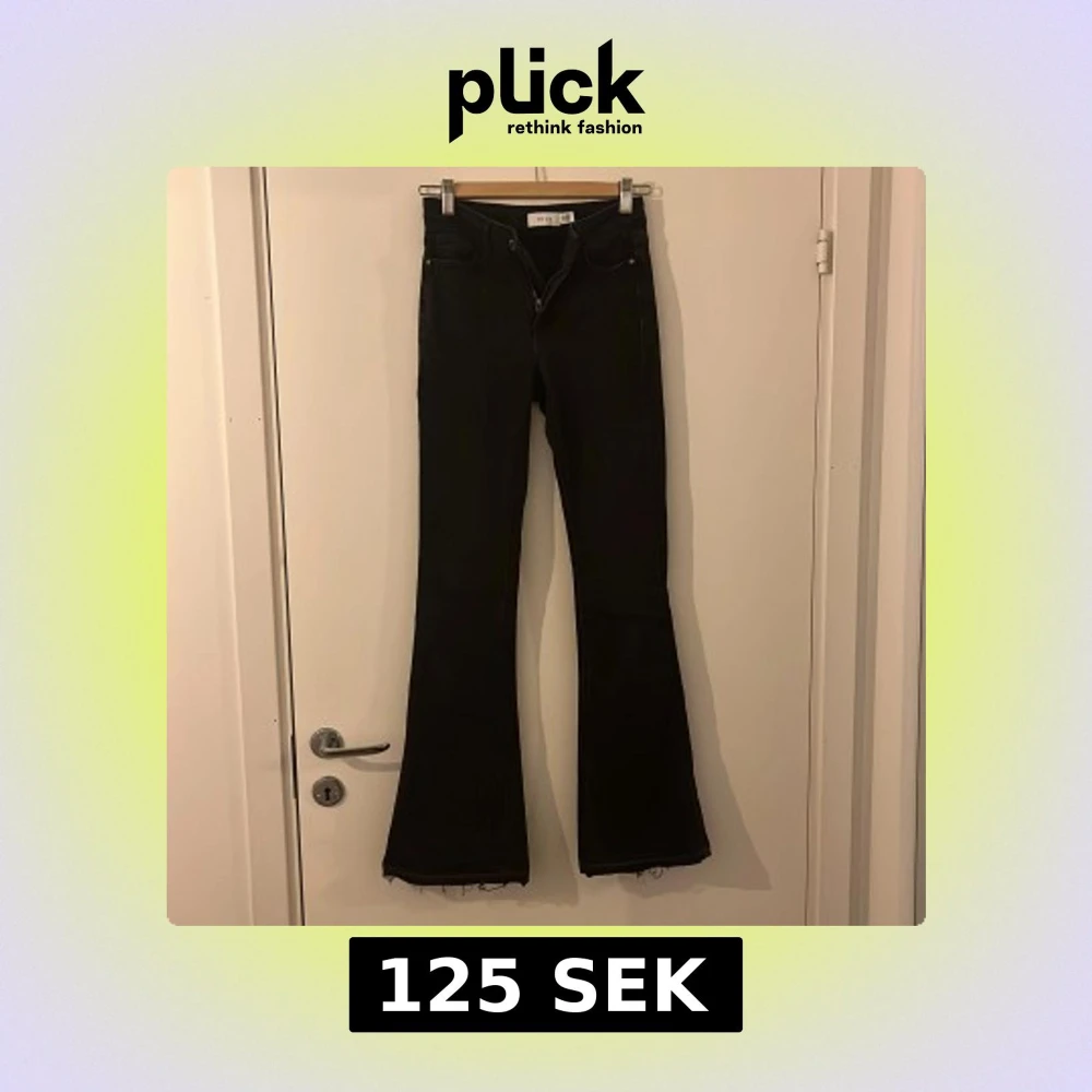 Svarta jeans från Vila med bootcut-modell. Sömmen i bensluten är uppsprättad då de var väldigt korta på mig. Knappen i midjan är lite böjd på insidan, den går att knäppa ändå, och det syns bara på insidan, men kanske kan vara bra att veta!