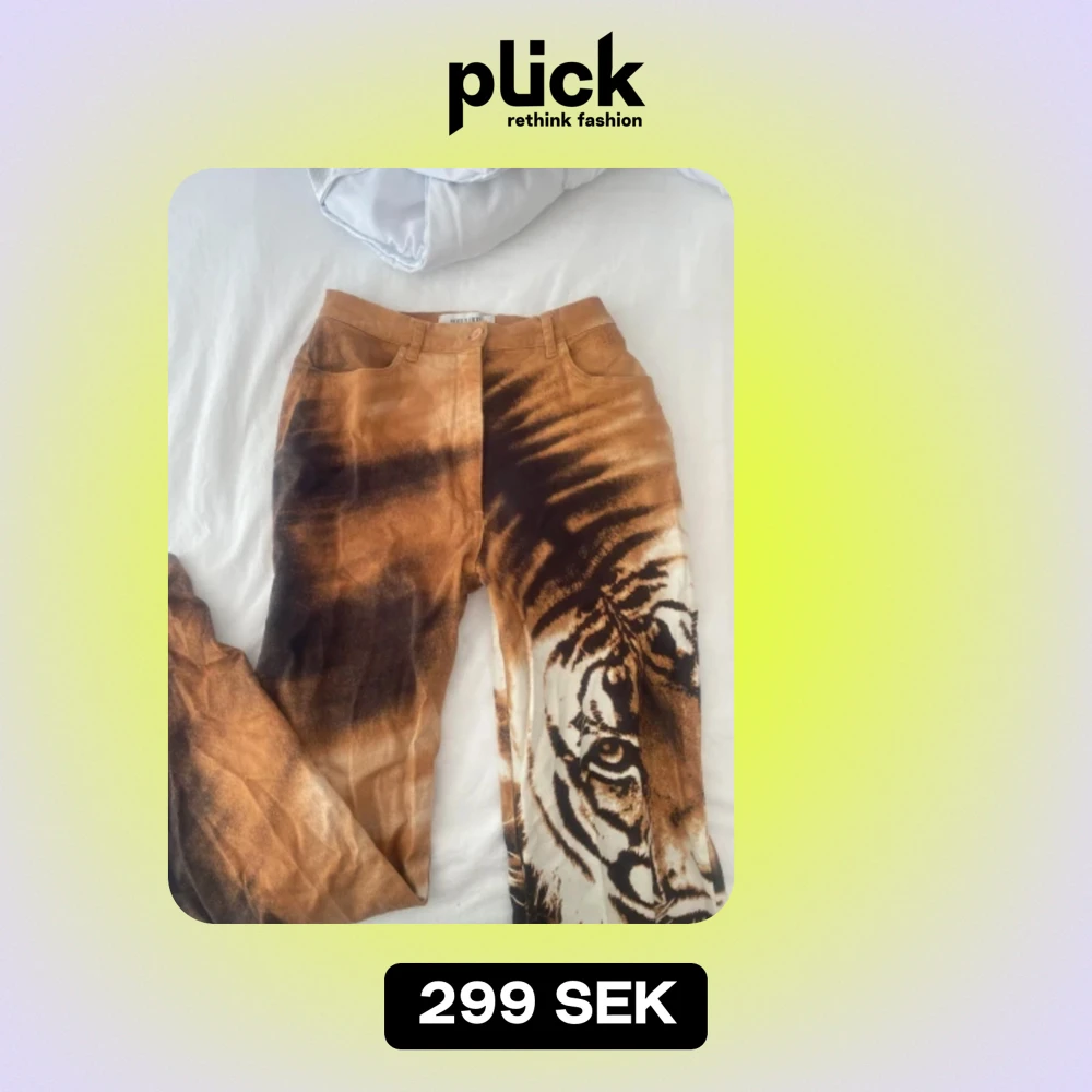 Byxor med lejon print storlek 38, köpta på humana. Flare med mid/highwaist. Använda 2 gånger