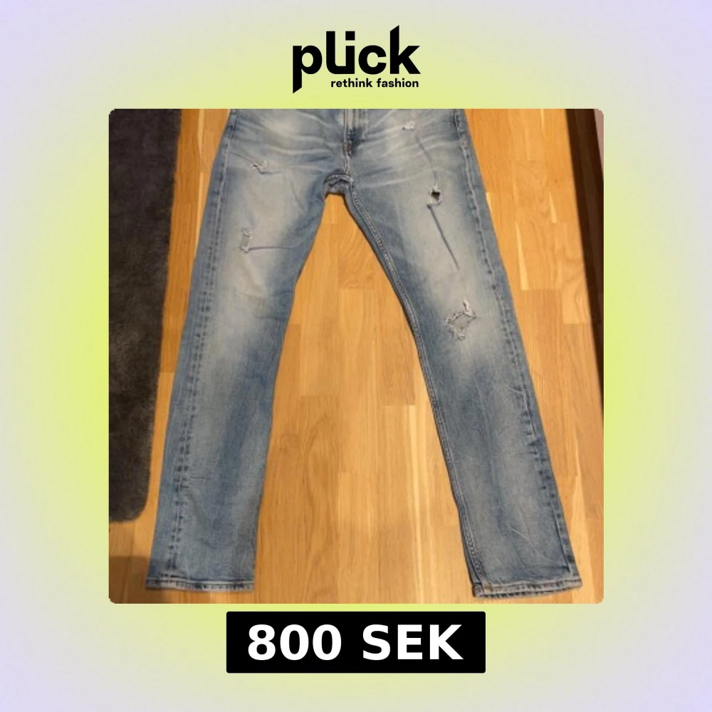 Säljer ett par ljusblå jeans från Calvin Klein i storlek W31 L32. Jeansen har slitna detaljer och diskreta revor framtill, klassisk femficksdesign och raka ben. Materialet är jeans med snygg tvättad look och kontrastsömmar.