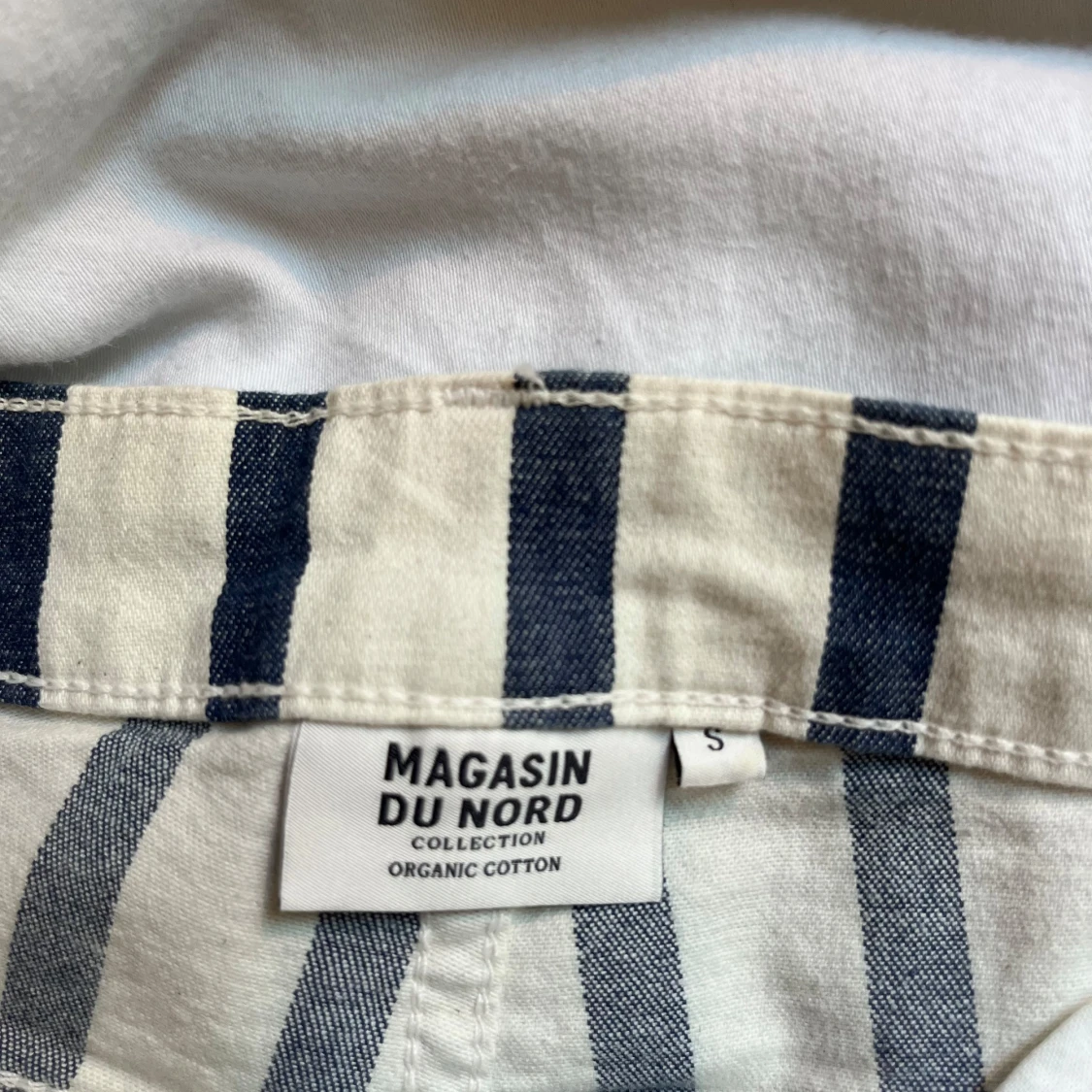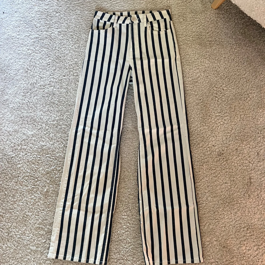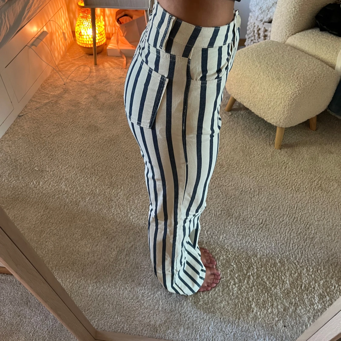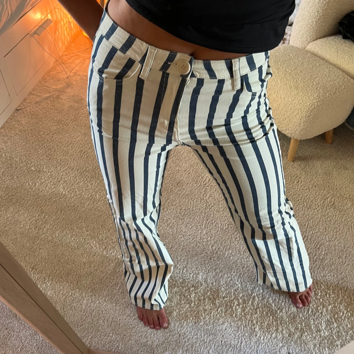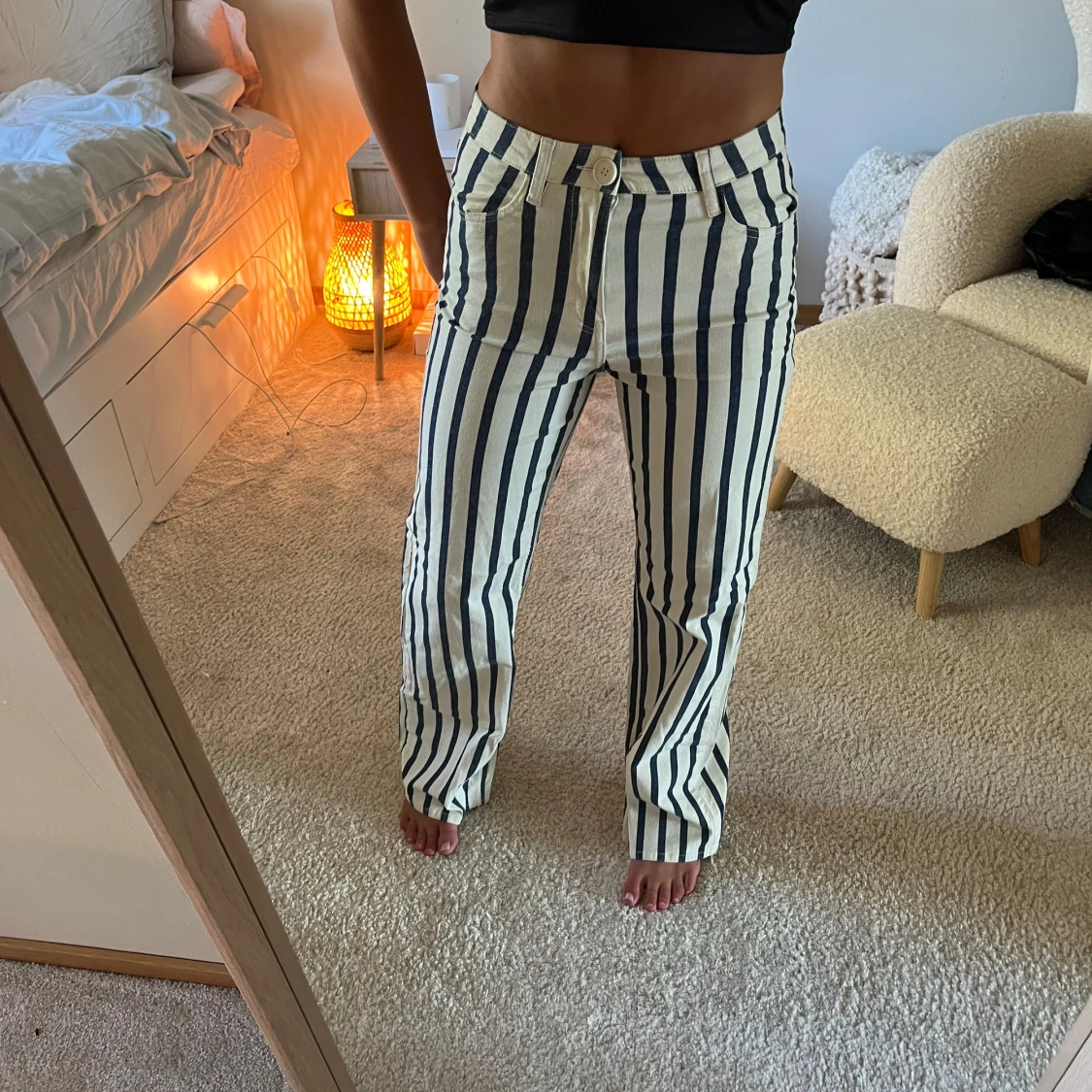 Snygga byxor med raka ben och hög midja i vit bomull med marinblå vertikala ränder. Klassisk femficksmodell med knapp och dragkedja framtill. Perfekta för dig som vill sticka ut med ett coolt mönster och bekväm passform.