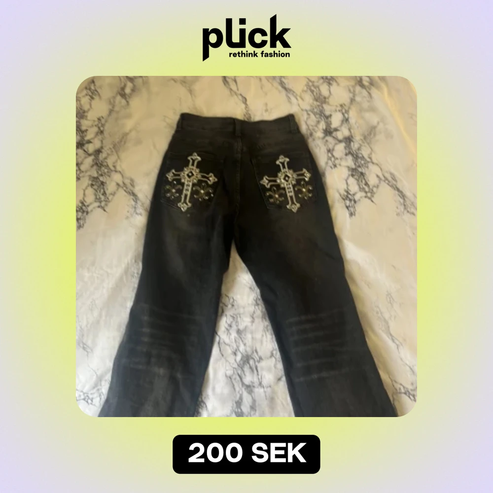 Svarta bootcut jeans med nitar - Säljer ett par svarta jeans med bootcut-snitt och låg midja. Jeansen har coola silverfärgade nitar på fickorna både fram och bak, vilket ger dem en edgy vibe. Materialet är klassisk jeans och passformen är normal. Perfekta för dig som gillar detaljer och vill sticka ut. Nitarla lagda själv och sprättat upp nere vid benet