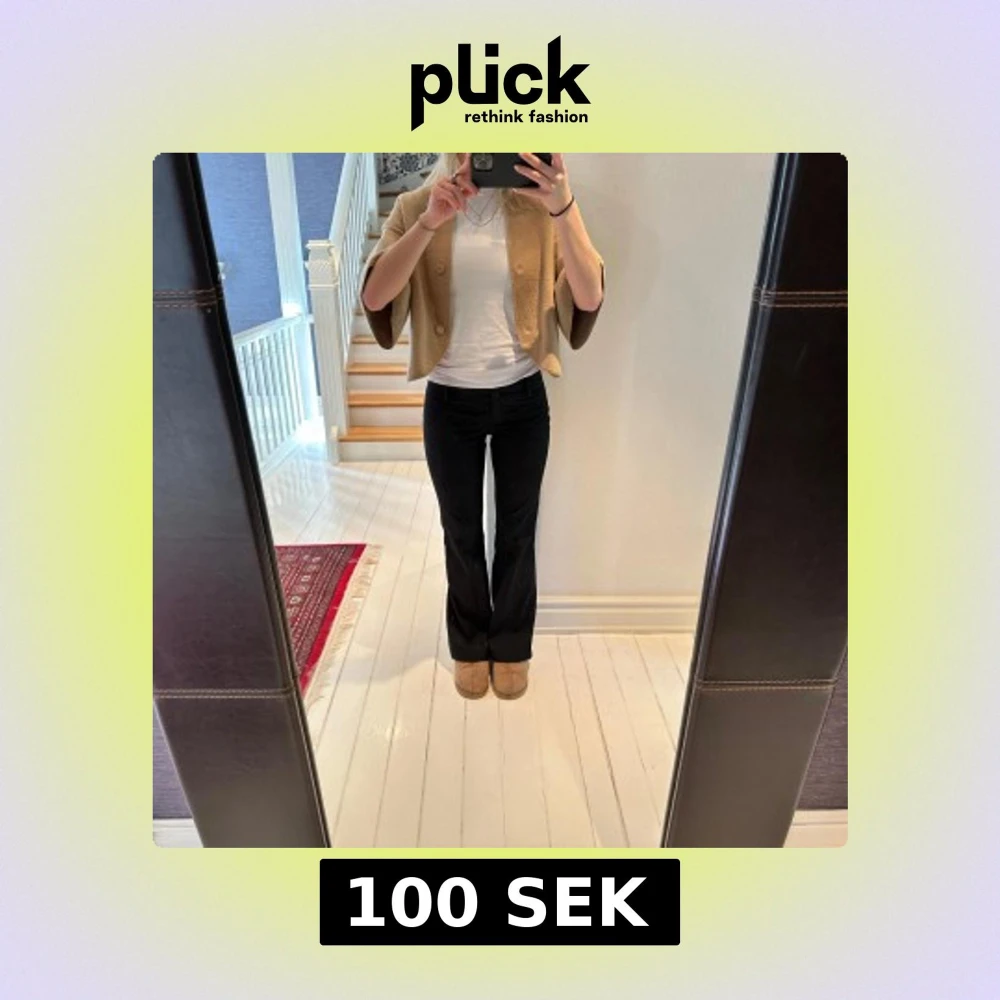Svarta lätt randiga utsvängda kostymbyxor. Låg midja. Liten 36 eller stor 34. PostNord spårbar frakt tillkommer på 67kr