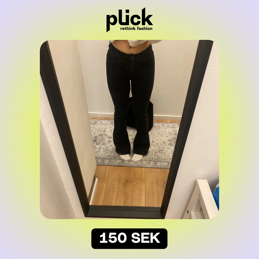 Säljer ett par svarta bootcut jeans i mycket bra skick. De är och har en snygg passform som framhäver figuren. Perfekta för både vardag och fest!