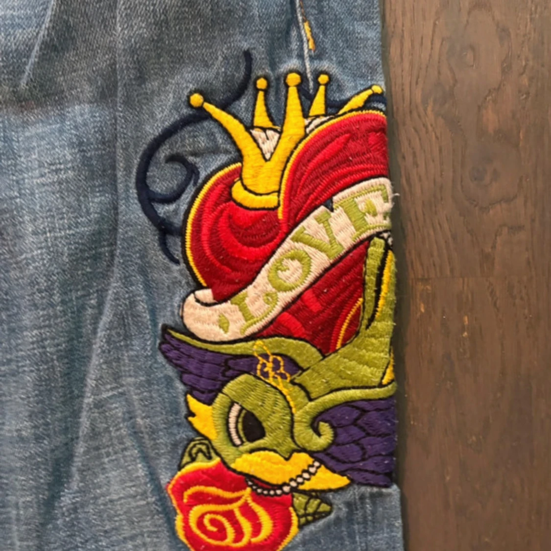 Blå bootcut jeans från American Republic med stort färgglatt broderi på ena benet med hjärta, krona och texten 'LOVE'. Jeansen har slitna detaljer, låg midja och klassisk femficksdesign. Materialet är denim med cool vintagekänsla. Midjemått: ca 37cm Innerbenslängd: ca 86cm grenhöjd: ca 18cm💕💕