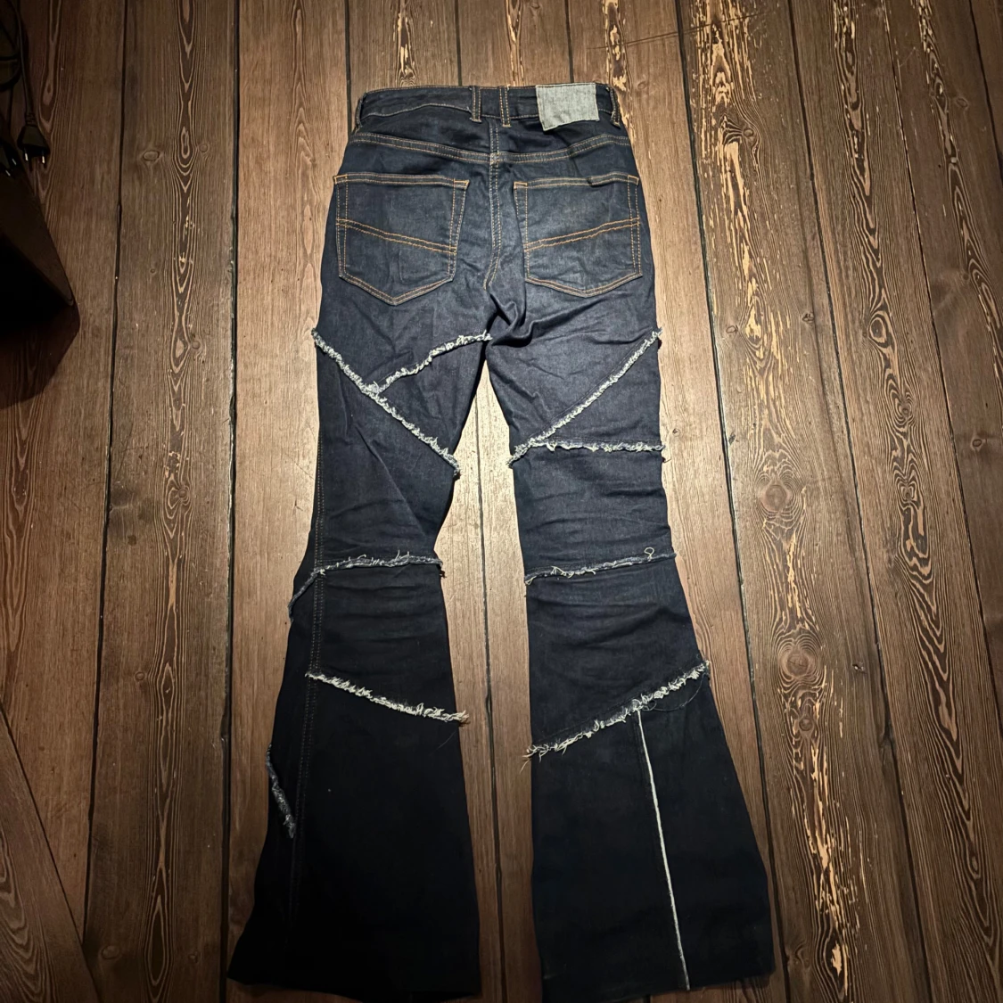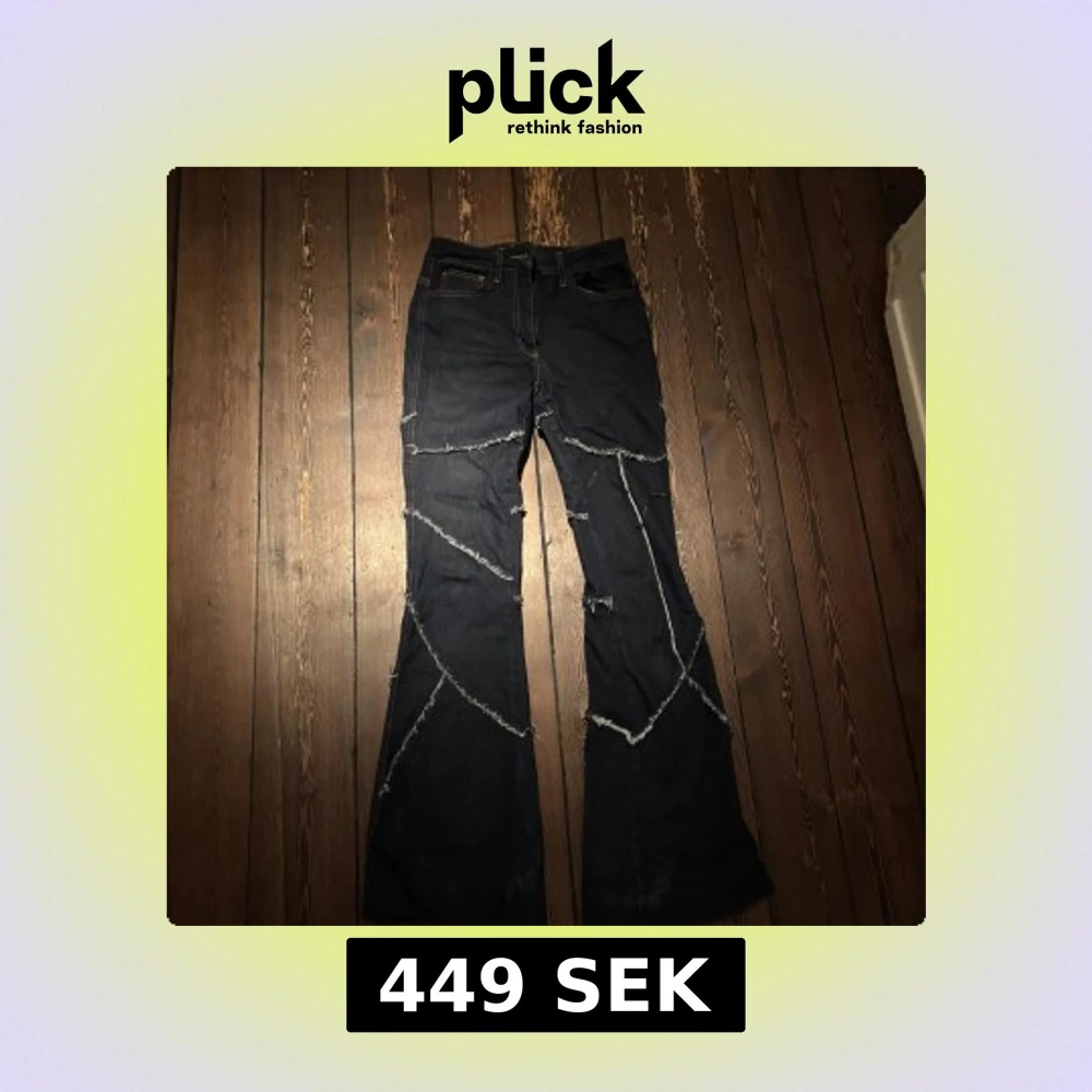 Snygga svarta jeans från Collusion med unika fransiga detaljer som ger en edgy look. Byxorna har en bootcut-stil och är väldigt unika och coola. De är High waist men man kan lätt sy om de till low waist om man föredrar det