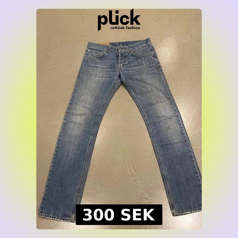 Säljer ett par ljusblå jeans från dondup med klassisk femficksdesign och raka ben. Jeansen har snygga slitningar och detaljerade sömmar på bakfickorna. Materialet är robust denim i bomull och passformen är normal. Perfekt för dig som gillar en avslappnad stil. Går att tvätta