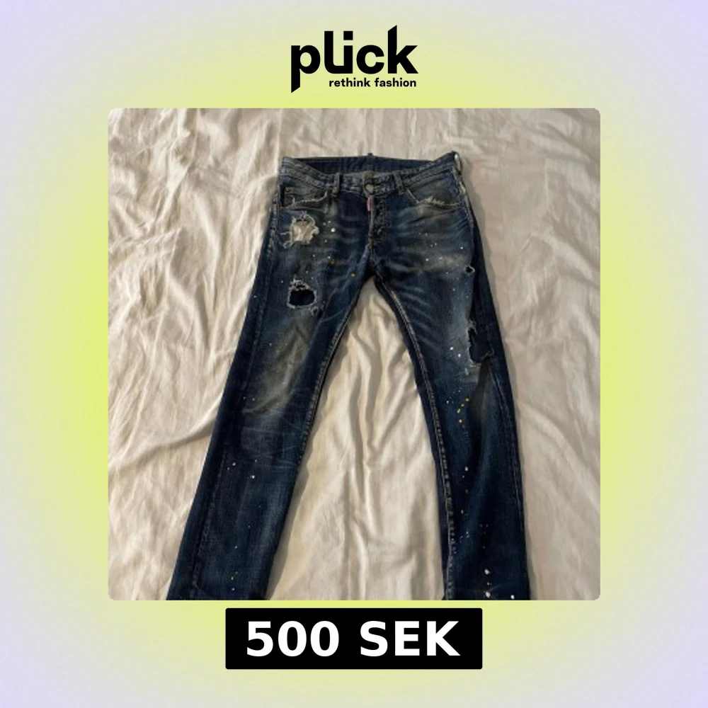 Säljer ett para feta dsquared jeans. Skicket är okej förutom att det är ett litet hål mellan benen på dom men syns inte vid användning. Och ett hål vid bakfickan men fixat med lag lapp. Storleken är 44 vilket passar xs-s