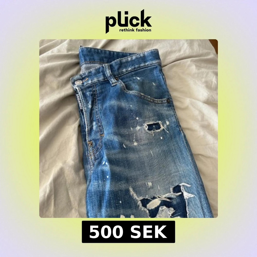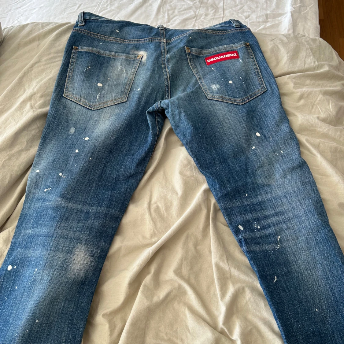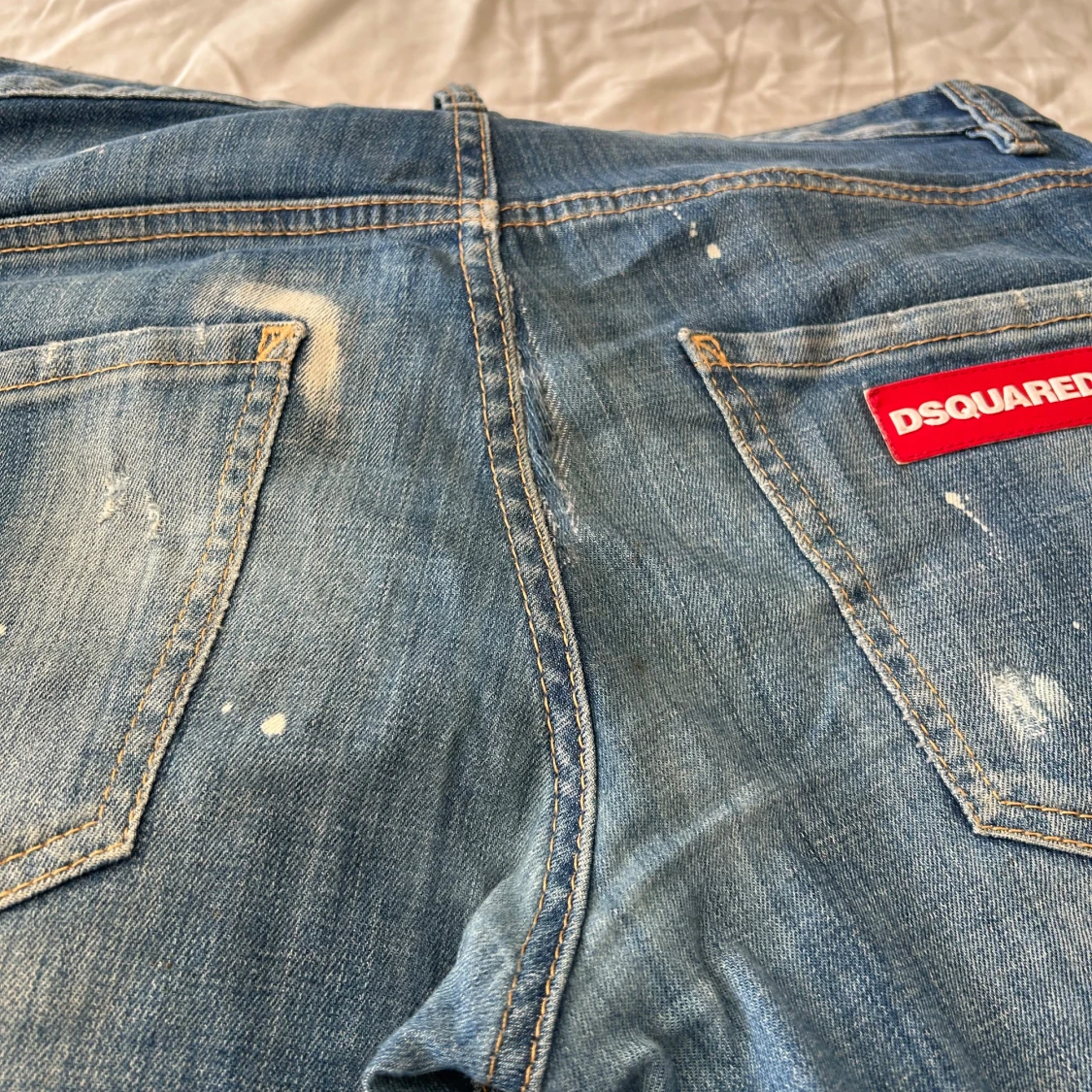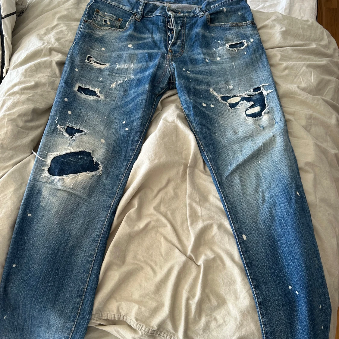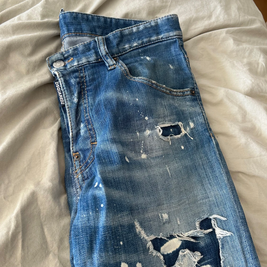 Säljer ett par blå jeans från Dsquared2 med tydliga slitningar, hål och färgstänk för en riktigt edgy look. Jeansen har klassisk femficksdesign, normal passform och Dsquared2-logga på bakfickan.