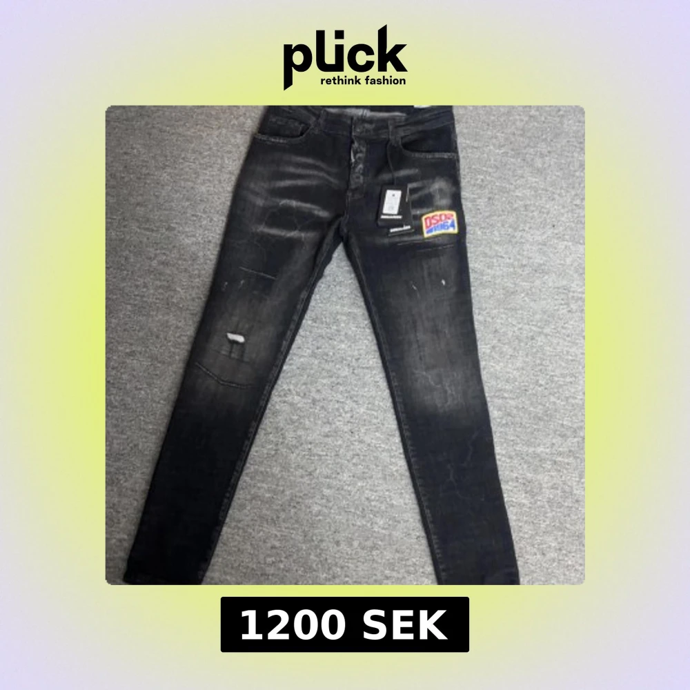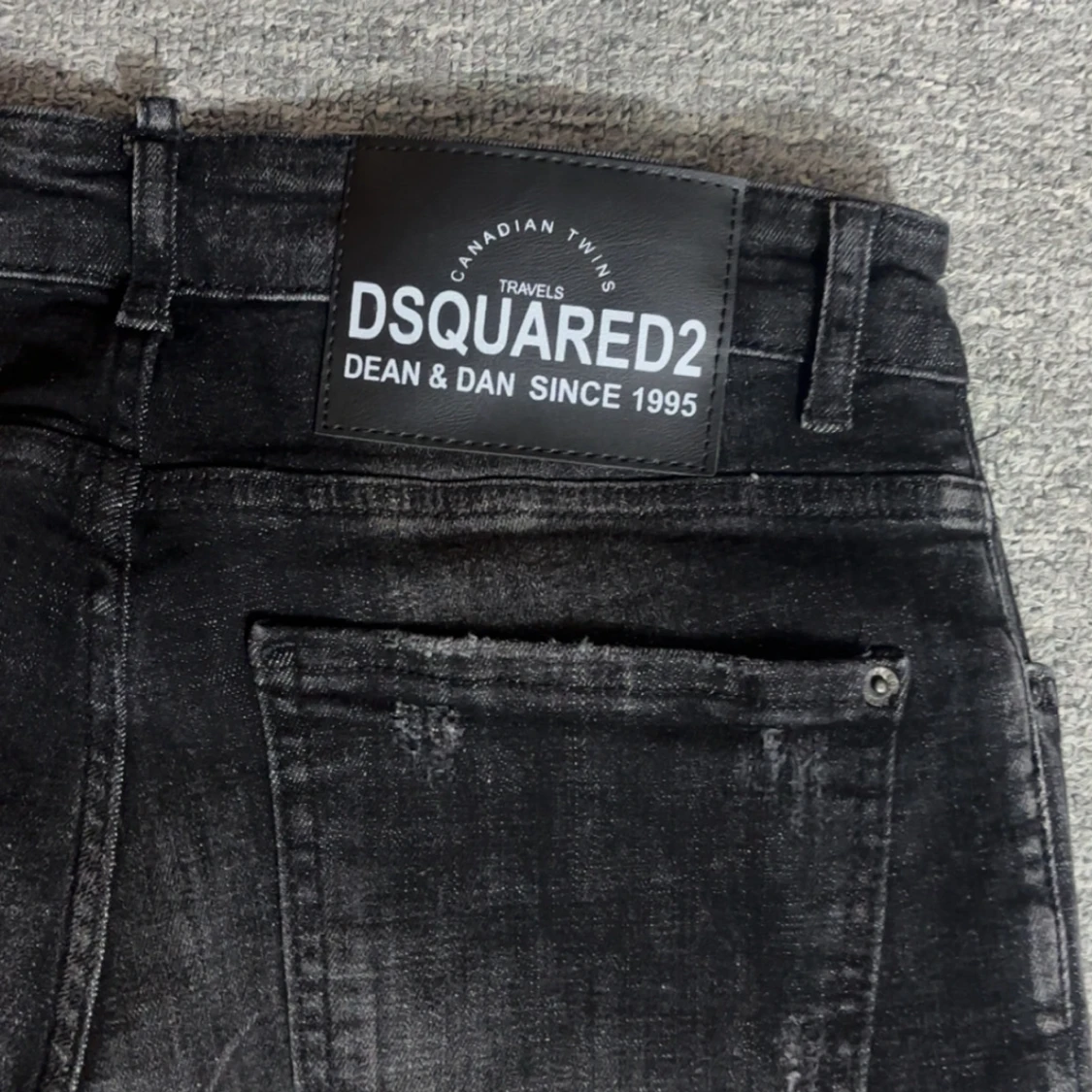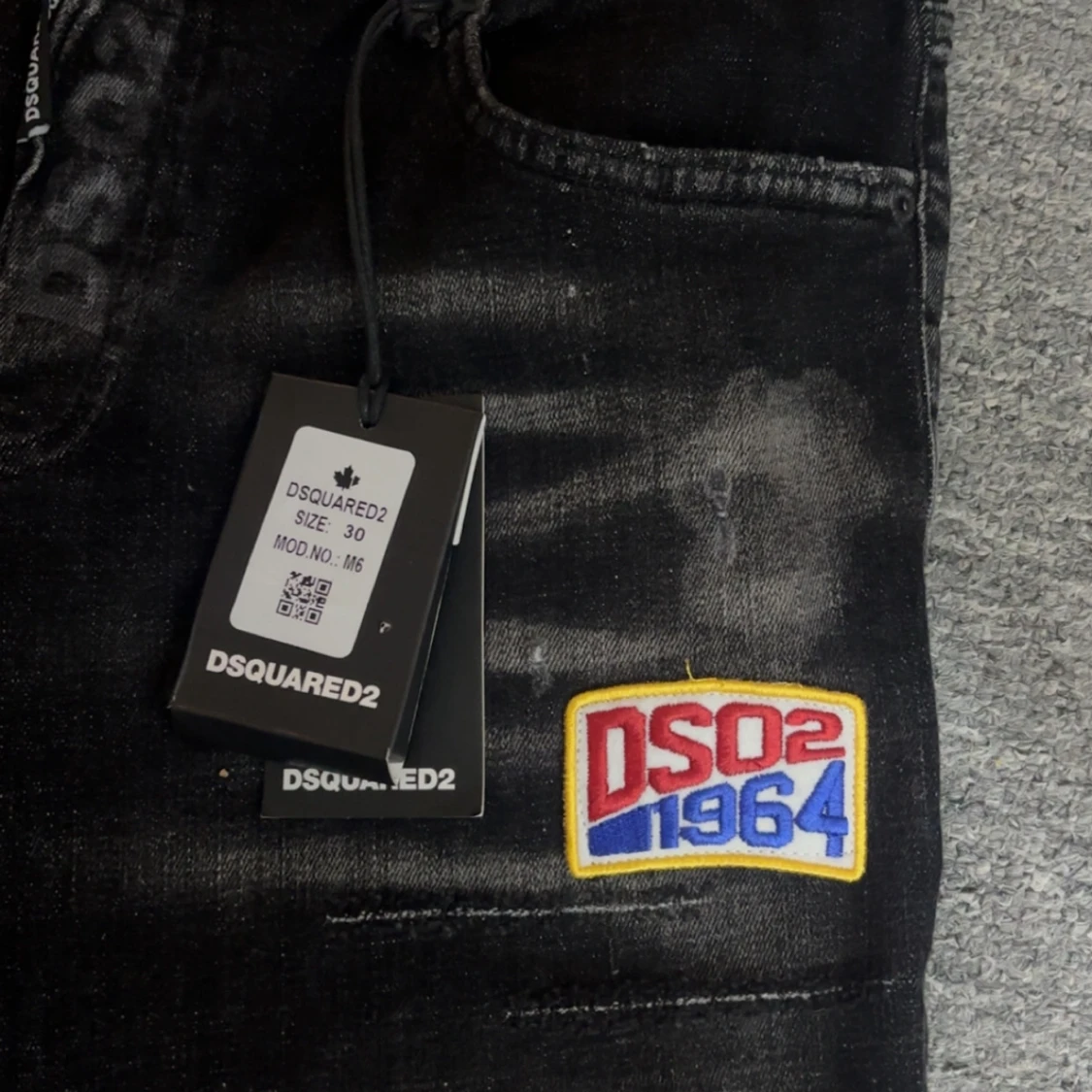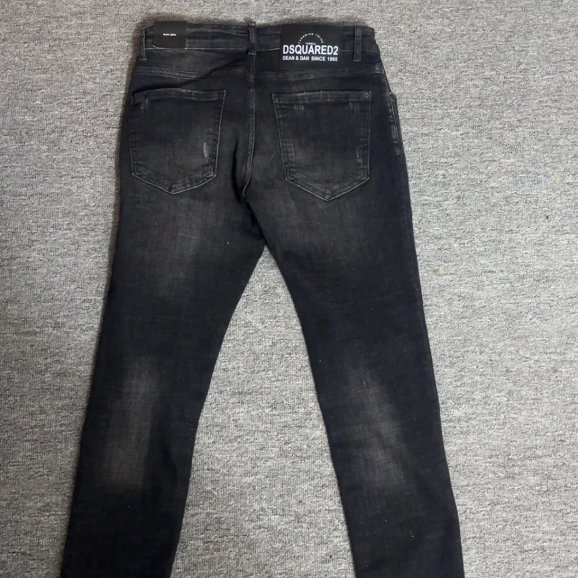 Snygga svarta jeans från Dsquared2 med skinny passform och slitna detaljer. Jeansen har en broderad patch med DSQ2 1964 på framsidan och en stor Dsquared2-label bak i midjan. Materialet är klassisk jeans och färgen är mörk med tvättade effekter.