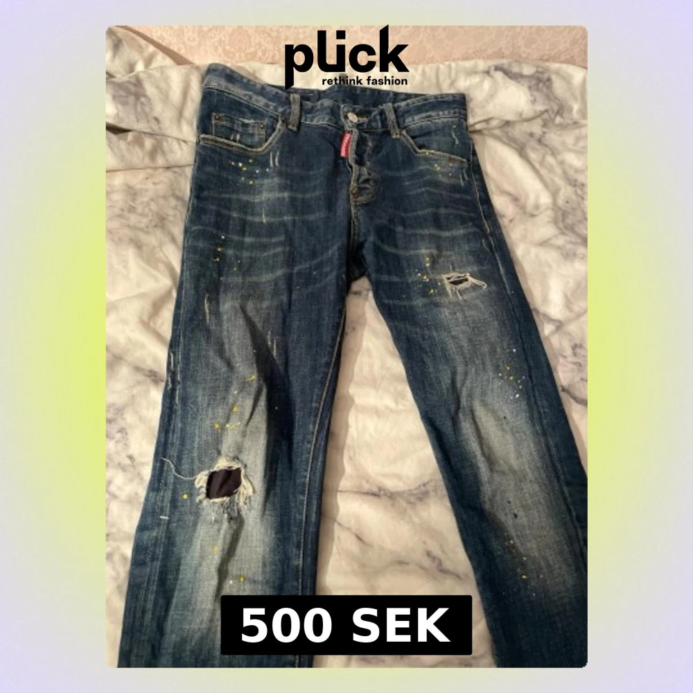 Säljer ett par blå jeans från DSQUARED2 i storlek 32. Jeansen har coola slitningar, hål på benet och färgstänk i gult och vitt som ger en edgy vibe. Klassisk femficksmodell med läderpatch bak och tydliga tvättade detaljer. Tillverkade i Italien.